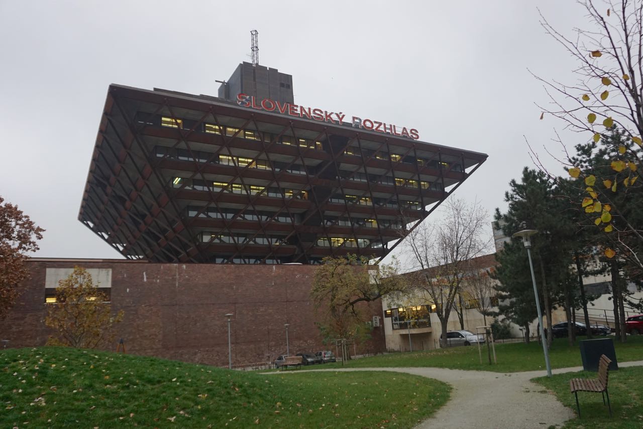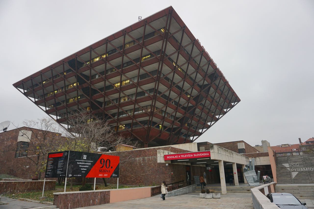 Een van de merkwaardigste gebouwen van Bratislava en ver daar buiten is het Slovensky Rozhlas: het gebouw van de Slowaakse Radio en – sinds 2011 ook – Televisie. Het lijkt erop alsof een gigantisch ruimteschip een piramidevormig onderdeel heeft verloren dat op aarde is neergestort en zich met zijn punt in de grond heeft geboord.