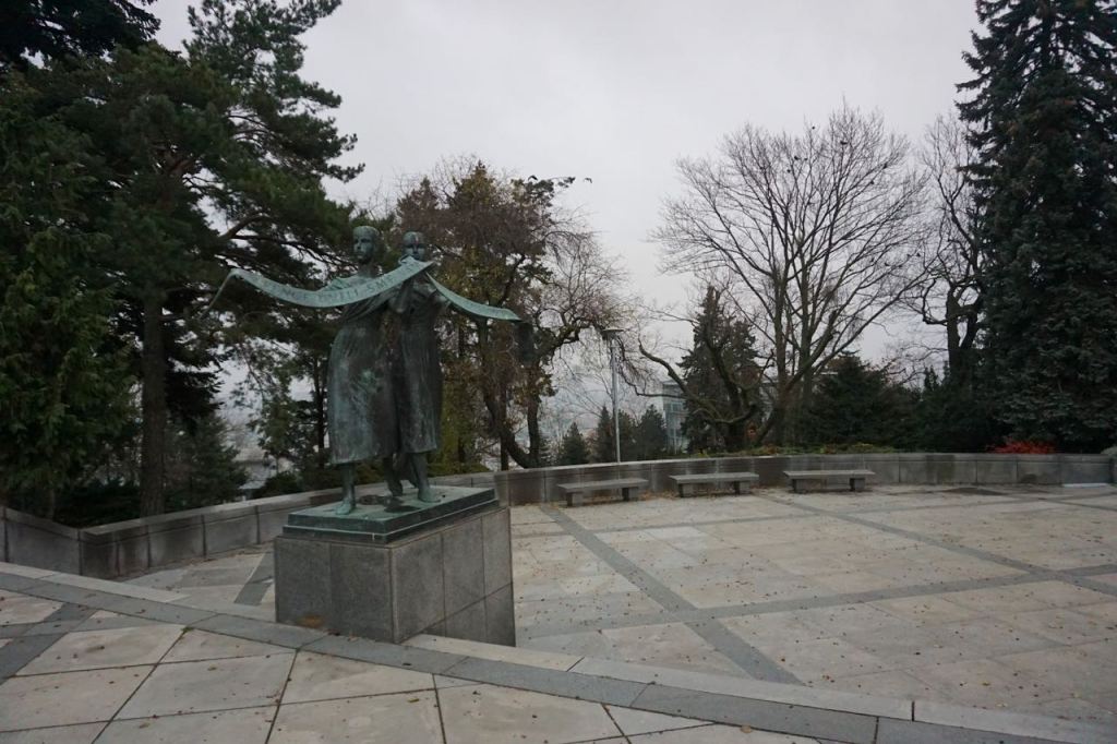 Het is een stevige klim naar het oorlogsmonument Slavín. Je loopt via smalle weggetjes en soms trappetjes omhoog, langs de villa’s van Malé Karpaty. Je hebt mooi uitzicht op afwisselend de oude en de nieuwe stad.