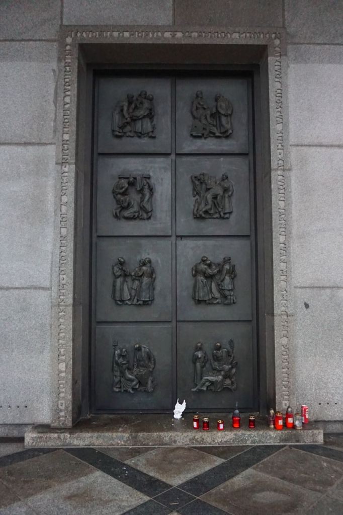 Voor je de trappen bestijgt naar het plateau met het monument, passeer je een reliëf met soldaten waarvan er een neerknielt voor de ongetwijfeld rode vlag. In 2016 is er in Rusland een herdenkingsmunt van 5 roebel uitgebracht met dit plaatje erop, met op de achtergond het Slavín-monument.