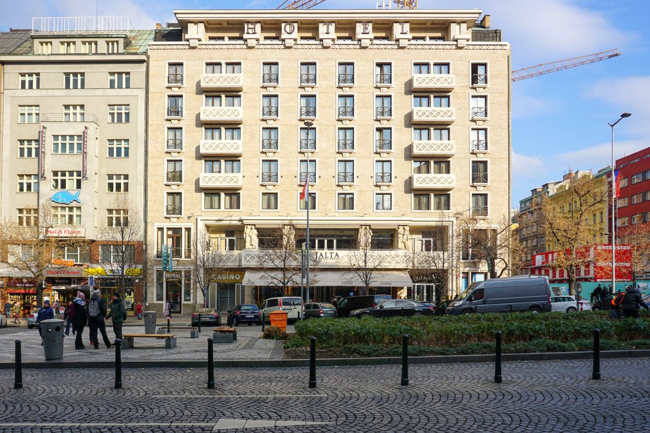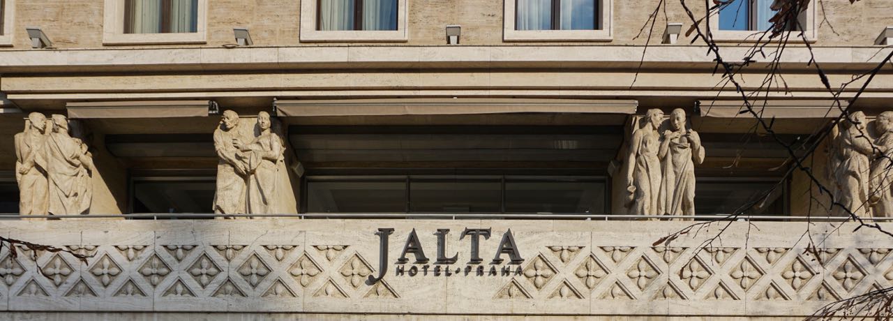 Hotel Jalta aan het Wenceslausplein werd in de jaren ’50 gebouwd in de stijl van het socialistisch realisme, wat je terugziet in de beeldenparen die de eerste verdieping sieren. Architect Antonín Tenzer was van de functionalistische school, en ook dat is goed te zien.