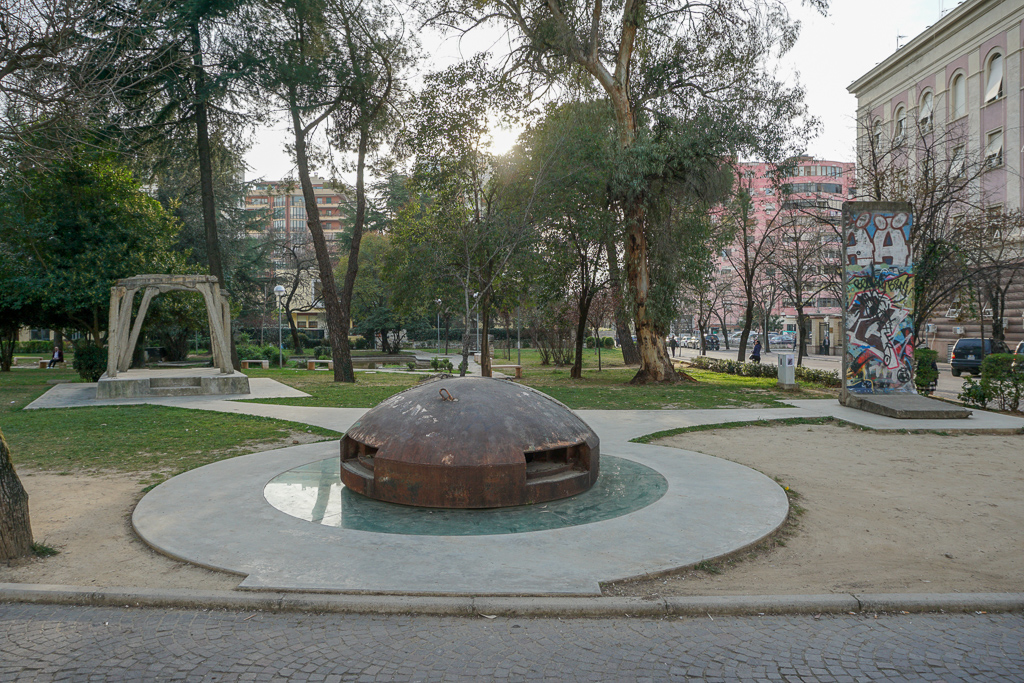 Als je verder loopt over de Bulevardi Dëshmorët e Kombit kom je langs het voormalige checkpoint van het Bllok. Een gedenkplaats waar de rare combinatie van een typisch Albanese bunker, betonnen stukken van een tunnel van de beruchte Spaç-gevangenis en een stuk van de Berlijns Muur samenkomen.