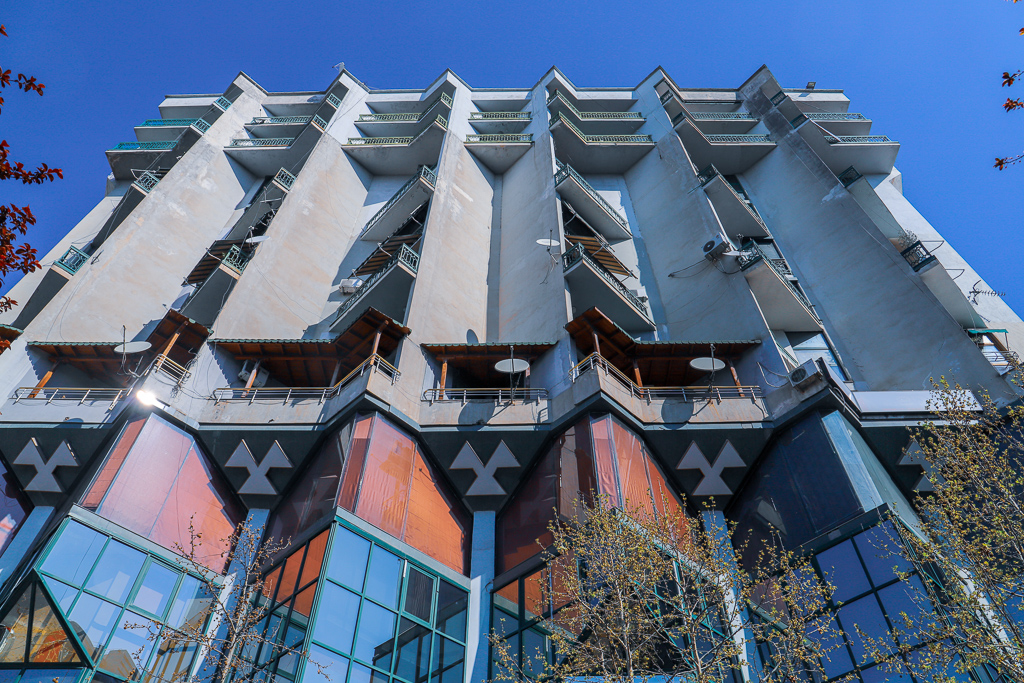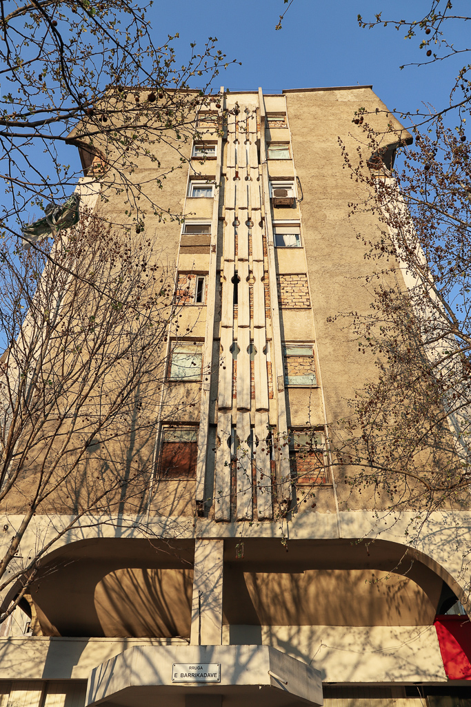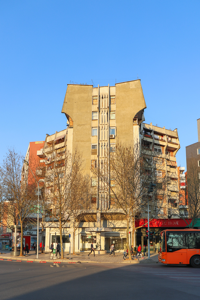 Aan je linker hand staat een waanzinnig gebouw, waarin het Muzeu Mezuraj is gevestigd. Ik ben het museum niet in geweest – ik had niet door dat er een museum was – maar ik had er graag binnen willen rondneuzen. Ik vind het echt een fantastisch gebouw, met de fraai vormgegeven balkons en zijn radioactieve voorkomen. Ik heb geen enkele informatie over het gebouw kunnen vinden. Ook de Facebookgroepen Socialist Modernism en Brutalist Appreciation Society, met al zijn experts, hebben me niet verder kunnen helpen. Jij wel? Laat het me weten!