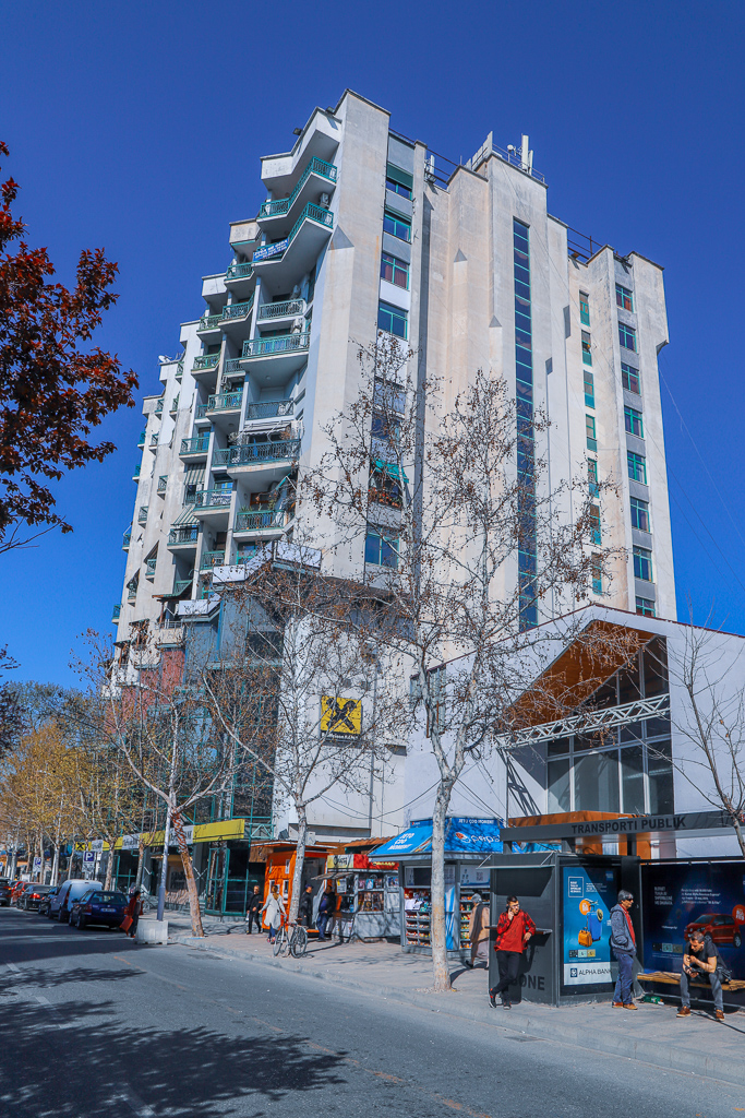 Loop terug via Rruga Bardhok Biba. Je komt weer uit op het Skanderbegplein. Er staan aan de Rruga e Barrikadave weer wat fraaie Albanese Plattenbauflats.