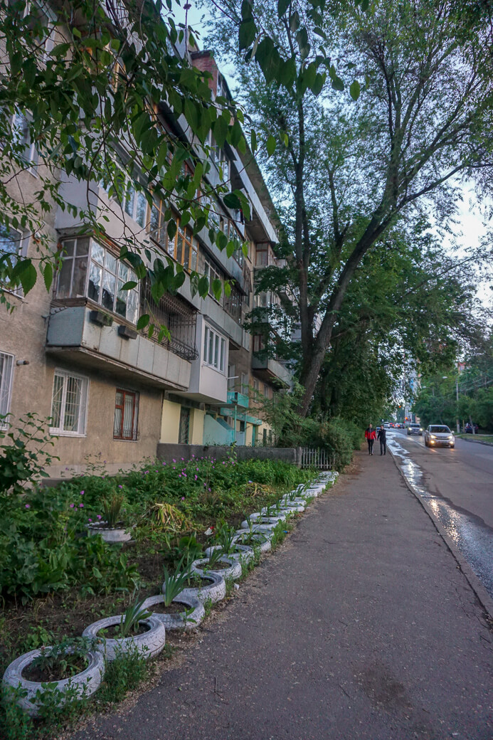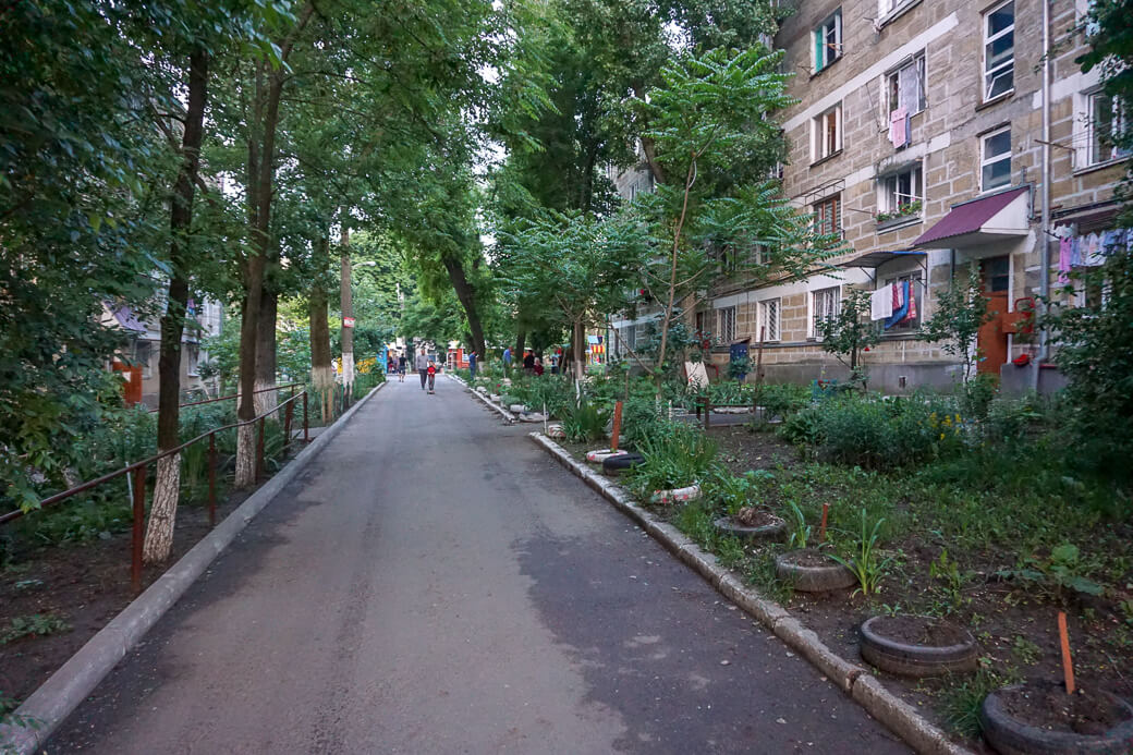 Loop door langs het mozaïek en sla rechtsaf de Strada Drumul Viilor in. Rechts zijn typisch Russische woonflats. Sla een straat in om een kijkje te nemen. Sovjet-speeltuintjes wisselen hele moderne af, de groenvoorziening is prima voor elkaar dankzij particulier initiatief, geverfde autobanden zijn omgevormd tot plantenbakken en het gonst er van het buitenleven. Dit zijn geen huizen van topkwaliteit, maar de mensen maken er wat van. Aan een van de flats aan de Strada Drumul Viilor zie je nog een mooi reclamebord uit de Sovjettijd.