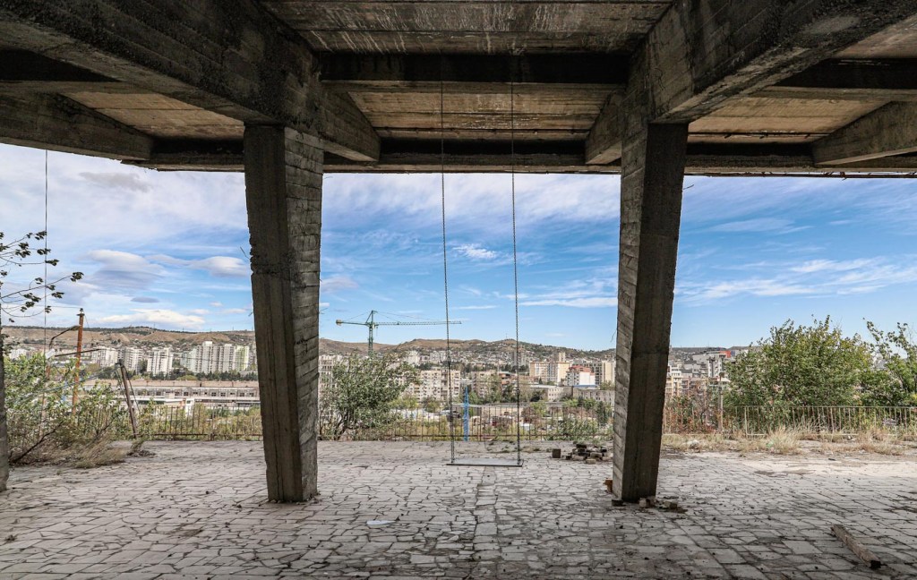 Vanaf het waanzinnig mooie hoofdkantoor van de Bank van Georgië en het bizarre voormalig Rekencentrum voor het Energiesysteem van de Trans-Kaukasus is het anderhalve kilometer lopen naar het Auditorium. Een gezellige route is het niet, over de stoep langs een drukke uitvalsweg langs de rivier Koera. Via een weg met haarspeldbochten kom je na een kort klimmetje aan bij het Auditorium, een brutalistische dinosaurus van een gebouw.