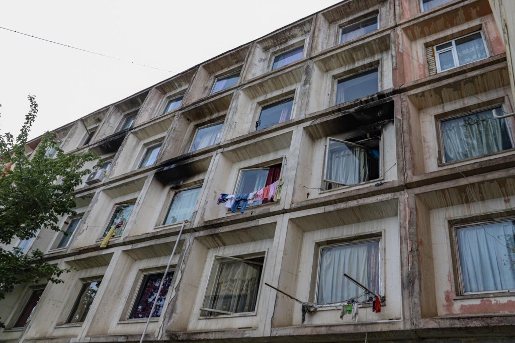 De voormalige studentenflats erachter maken een troosteloze indruk. De studenten die er woonden, zijn vervangen door ontheemden die tijdens de burgeroorlog Abchazië zijn ontvlucht. Roet heeft zich vastgezet boven een aantal van de ramen, waar binnenshuis vuurtjes zijn gestookt om de boel in de winter te verwarmen. Er is ook een Abchazisch schooltje gevestigd in een gebouw, grenzend aan het Auditorium.