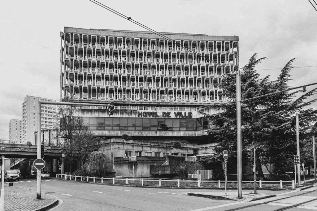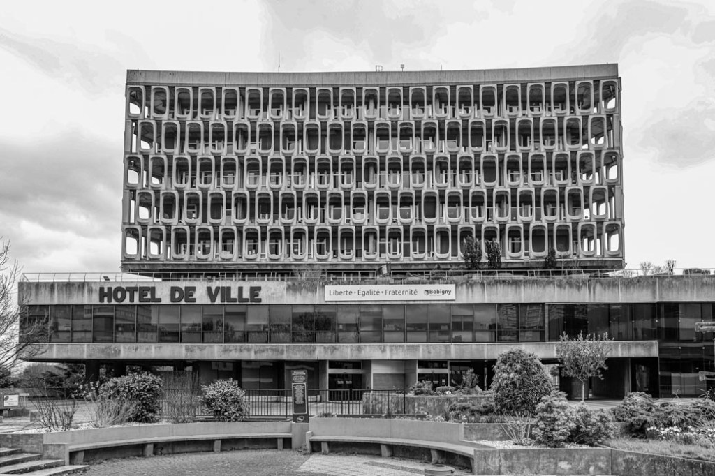 Het stadhuis van Bobigny – Hôtel de Ville – grenst aan het Centre Commercial. Het is een schoolvoorbeeld van brutalistische architectuur, met zijn – wederom – corduroy-beton in combinatie met béton brut: onafgewerkt beton waarin de houtstructuur van de mallen waarin het beton is gegoten, nog te zien is.