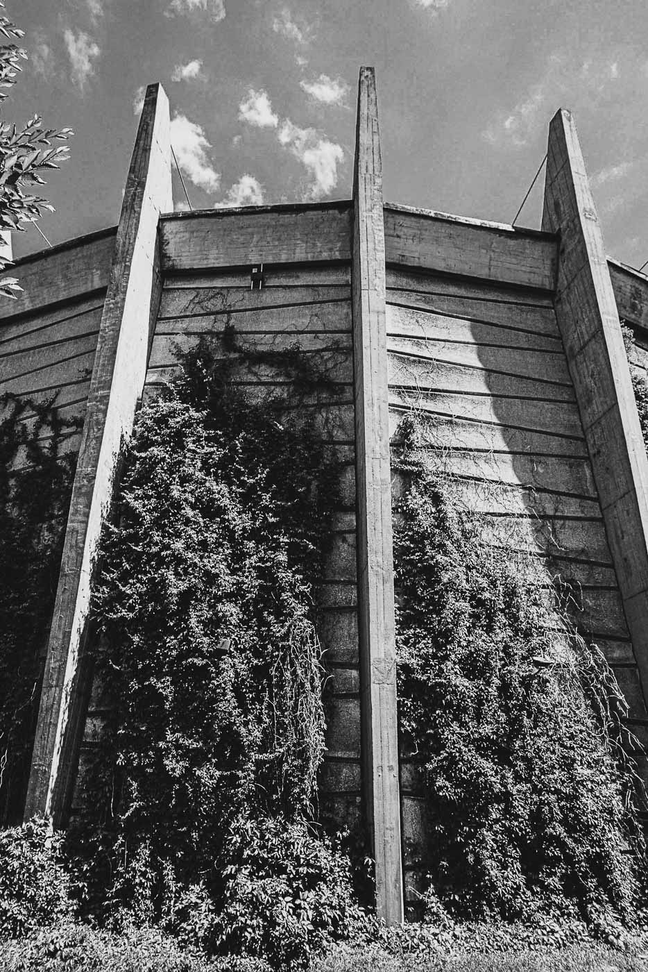De Rotunda is een ronde constructie, opgebouwd uit 24 geprefabriceerde betonnen steunberen. De muren zijn opgebouwd uit wigvormige betonelementen. Béton brut in optima forma: het lijkt wel gefossiliseerd hout. De zichtbare structuur van het gebouw – niet alleen de kolommen, maar ook de kabels waaraan het glazen dak hangt zijn zichtbaar – en het gebruik van béton brut maken de Rotunda uniek.