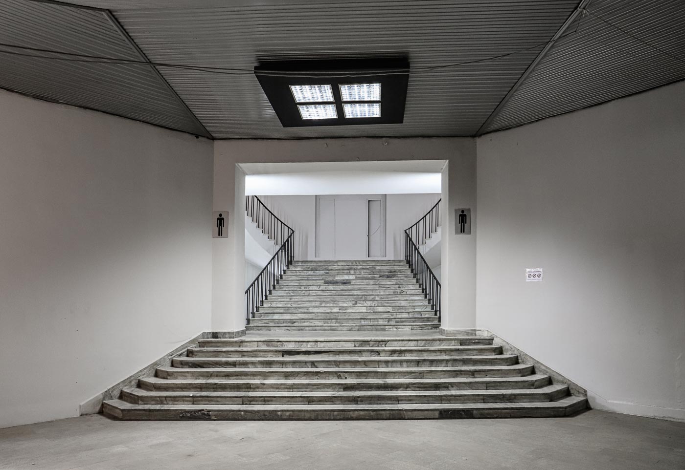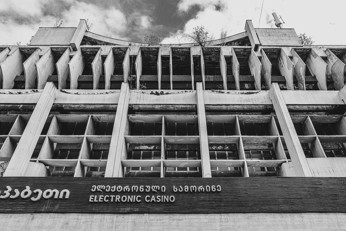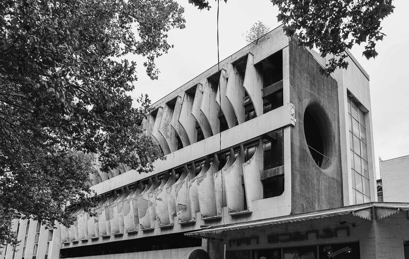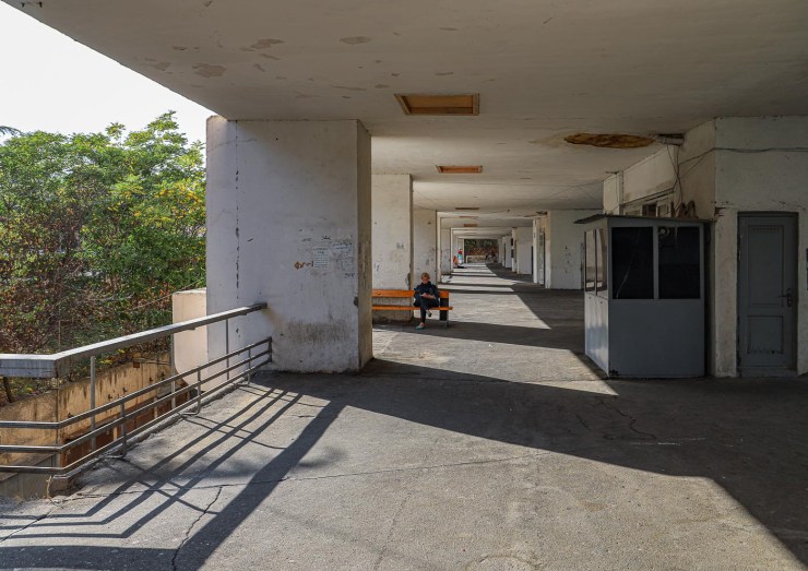 Loop terug naar de hoofdweg en sla rechtsaf, voorlangs De Muze, de Kostavastraat in. Daar vind je de voormalige Nationale Wetenschappelijke Bibliotheek, een behoorlijk verloederd pand uit de brutalistische school, waarvan foto’s met enige regelmaat worden gedeeld in aan brutalistische architectuur gewijde groepen op social media. Wat de architect precies voor ogen had ontgaat me, maar apart is het zeker. Op de benedenverdieping is een casino gevestigd in een uiterst lelijke uitbouw in schreeuwerige kleuren, die detoneert met het grauwgrijs. Alleen zwartwitfoto’s van het gebouw zijn daardoor te pruimen. Het beton is zo rot als een mispel, de natuur neemt het over getuige het groen dat op onverwachte plekken opschiet. Echt een gevalletje SOS Brutalism.