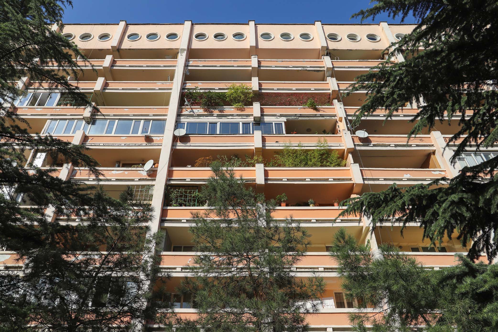 Nabij het stadion staan een paar imposant hoge Plattenbauflats uit de zeventiger jaren. Ik ben benieuwd wanneer in Nederland alle woonhuizen en -flats ontsierd gaan worden met airco’s, in Tbilisi is de ver-airco-ing in volle gang.