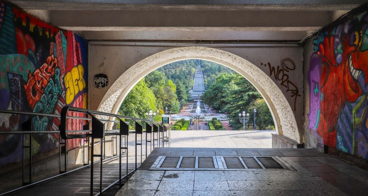 Loop via een tunnel, eindigend in een spannend poortje, onder de grote weg door het Vake Park in. Een uitgestrekt park tegen een helling op met het Graf van de Onbekende Soldaat en het Monument van de Overwinning. Je kunt je prima voorstellen hoe hier in Sovjettijd geparadeerd en met vlaggen gezwaaid werd.