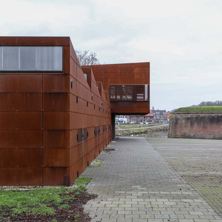 Tijdens mijn wandeling kom ik bij toeval langs een bijzonder gebouw in roestrood cortenstaal, met een zogenaamd zaagtanddak. Ik denk dat het bij de nabijgelegen vesting hoort, een museum of zo, maar nee, Roeivereniging De Hertog is in het gebouw gevestigd. Twee roeiende architecten hebben hun clubhuis zelf ontworpen, daarbij inderdaad rekening houdend met en inspiratie puttend uit de ligging nabij de Citadel en op een plek waar voorheen fabrieken waren gevestigd. Vanaf het balkon kunnen de clubleden hun roeiers aanmoedigen.