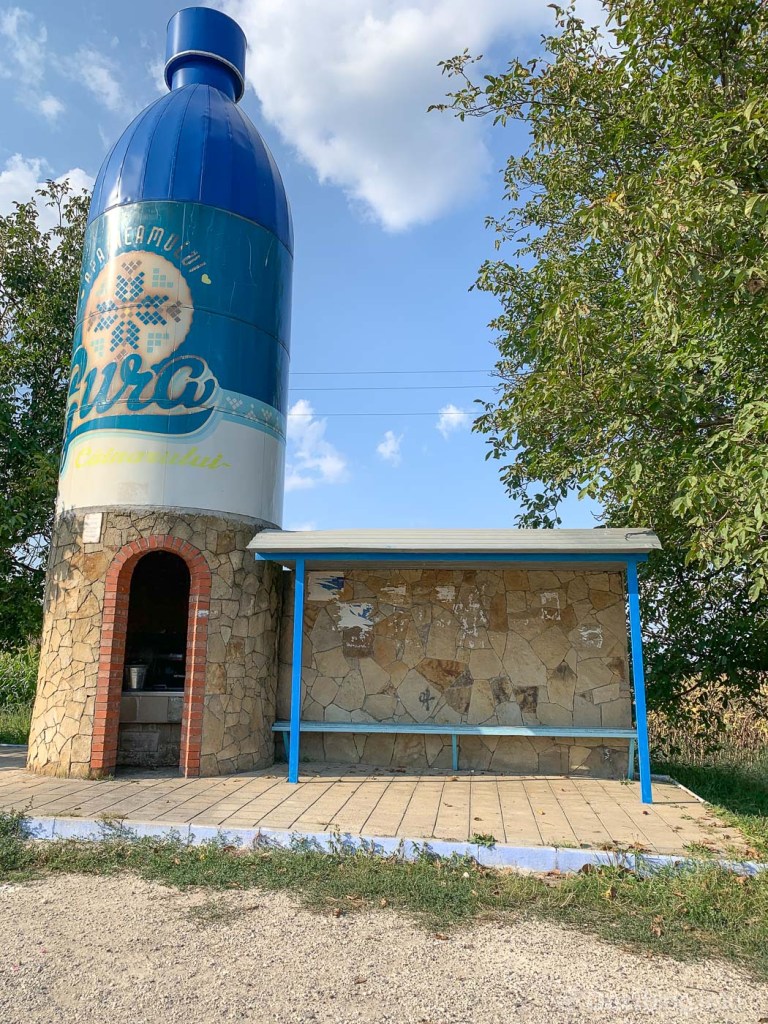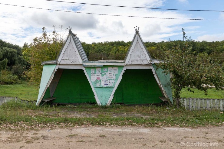 Veel bushokjes hebben een ovaal dak dat uitkraagt aan weerszijden van het eigenlijke hok, en rust op pijlers. Andere hebben een opvallend dak, zigzaggend of met omhoogstaande randen. Sommige zijn berekend op het droog houden van tientallen mensen, andere kunnen maar een paar ov-ers herbergen. De opvallendste afwijkende vormen zijn een houten geschakelde wigwam met de krullerig versierde dakranden – een typisch bouwkenmerk in Moldavië – en een niemendallig bushokje, geflankeerd door een enorme fles met een waterput erin. Die waterputten, ook weer in alle mogelijke vormen en maten – een ooievaar! – zijn ook typerend voor het Moldavische platteland, waar stromend water nog geen gemeengoed is.