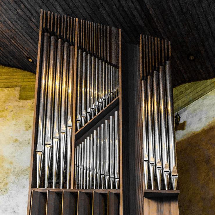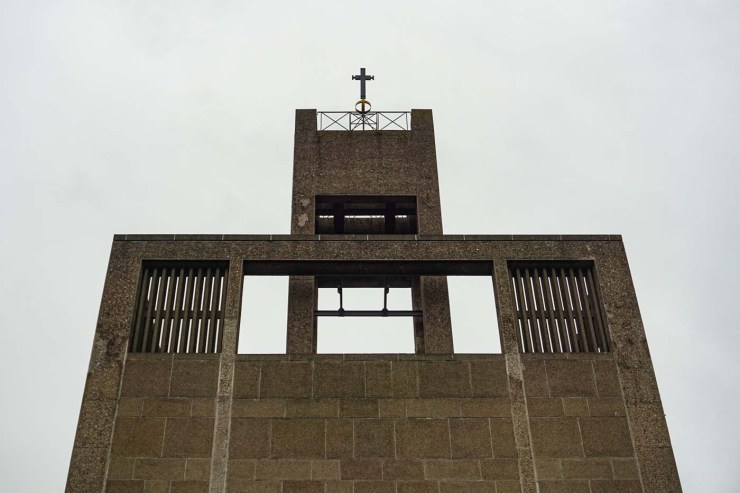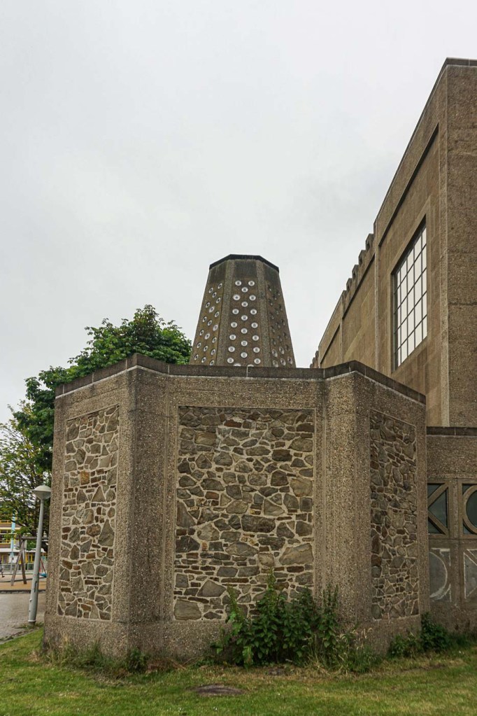 Alleen de massieve klokkentoren geeft iets weg van het meesterlijk brutalistische inwendige van de kerk. De Thomas is echt adembenemend mooi!