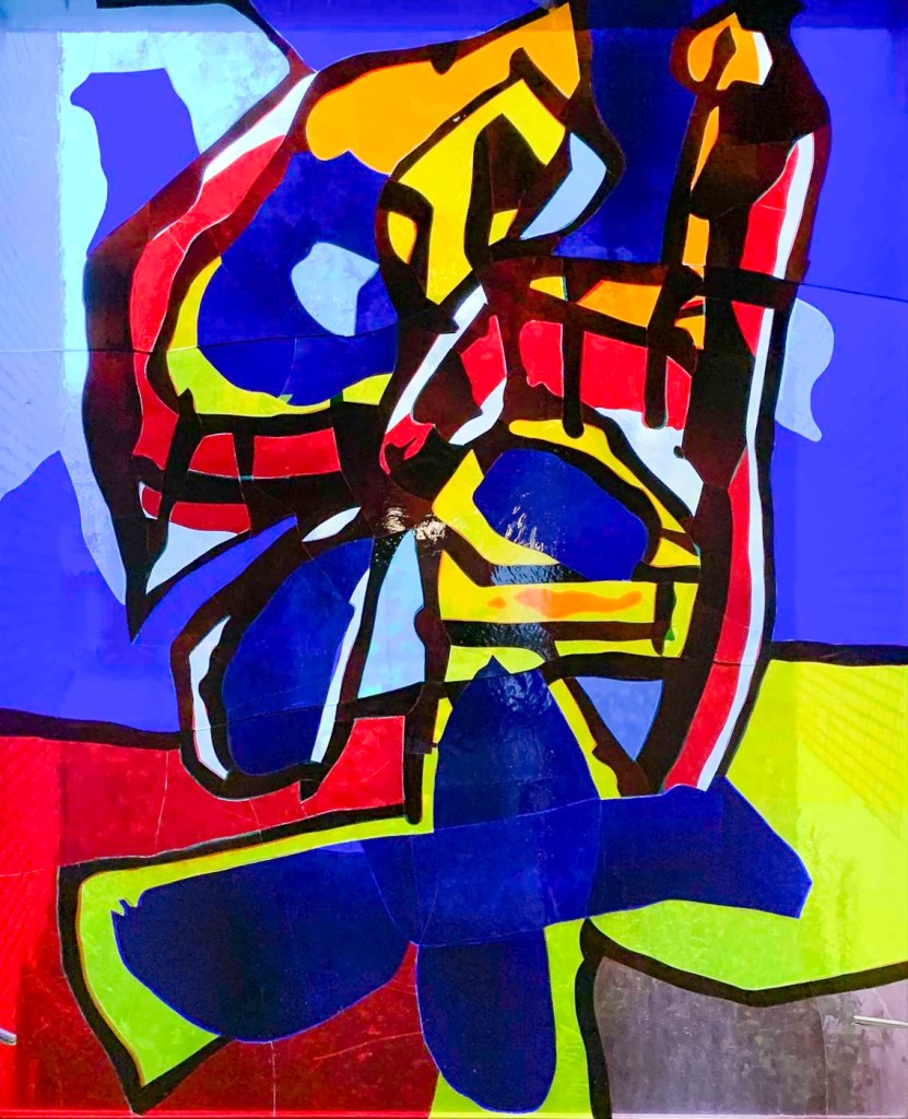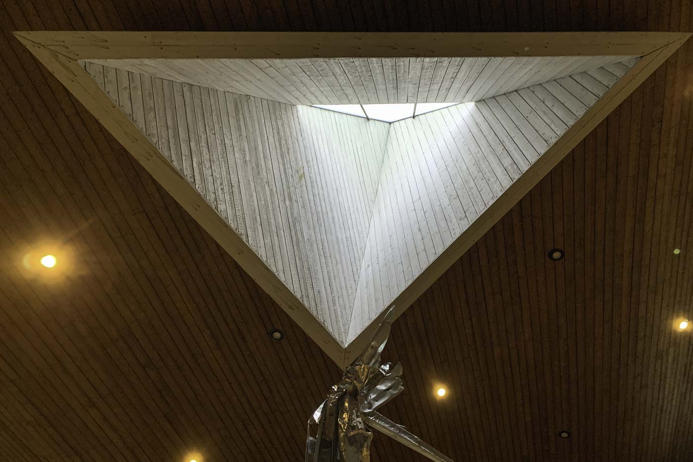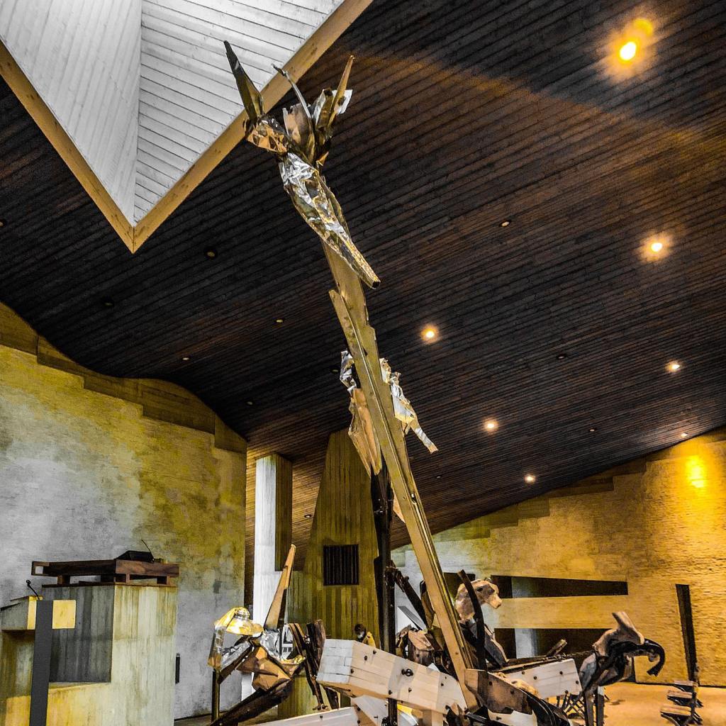 Bij de voorbereiding op de Betontour hebben Caroline en ik de mazzel dat we de kerk kunnen bezoeken. Het is de laatste dag dat daar een kunstwerk staat van Ivan Cremer, de zoon van Jan Cremer en zijn vrouw, de dochter van Karel Sijmons die de kerk ontwierp. Het kunstwerk, een haast Tatlin-achtig staketsel dat naar het driehoekige raam lijkt te reiken, past in de kerkzaal alsof het er voor is gemaakt. De volgende dag zal het kunstwerk worden afgevoerd, dus we hebben dubbel mazzel.