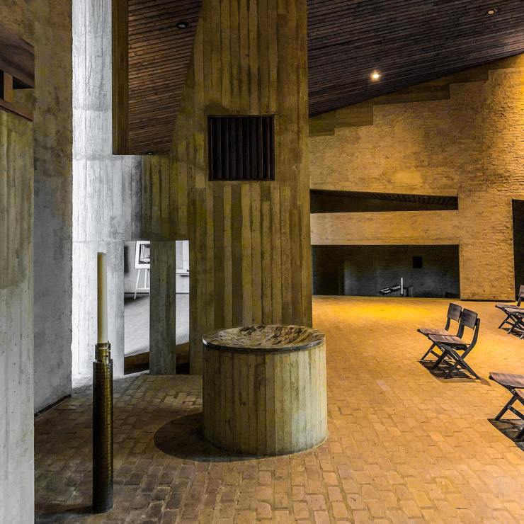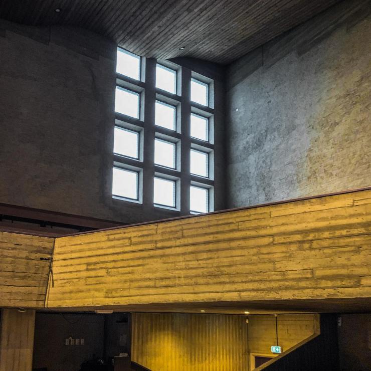 Ik ben onder de indruk van de stoere muren, trappen en wanden in gewassen beton en de vele originele interieurelementen, zoals de niet heel gezellige plafondlampen. De betonnen dragende balken hangen claustrofobisch laag. Het is meer bunker dan kerk. Helaas kunnen we de kerkzaal zelf niet bekijken, en een bezoek tijdens de Betontour zit er ook niet in, want dan is de kerk stemlokaal voor de Chileense verkiezingen. Dit vraagt om een nieuw bezoek.