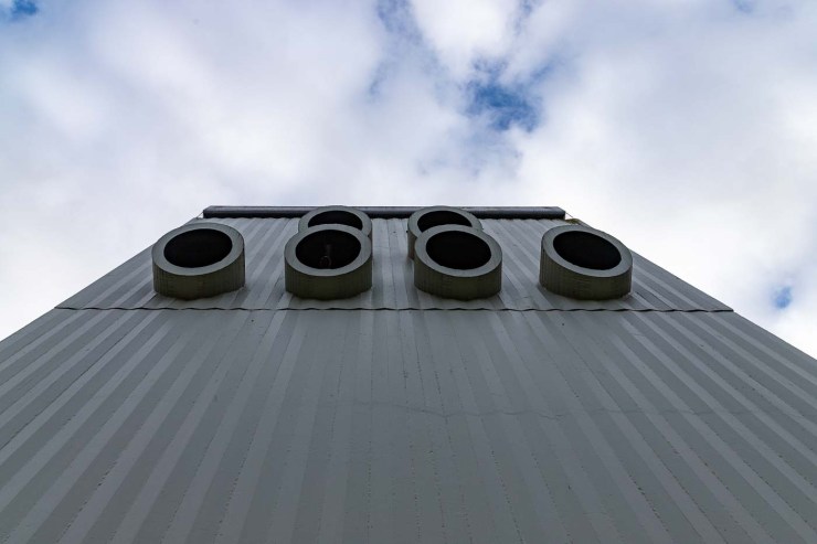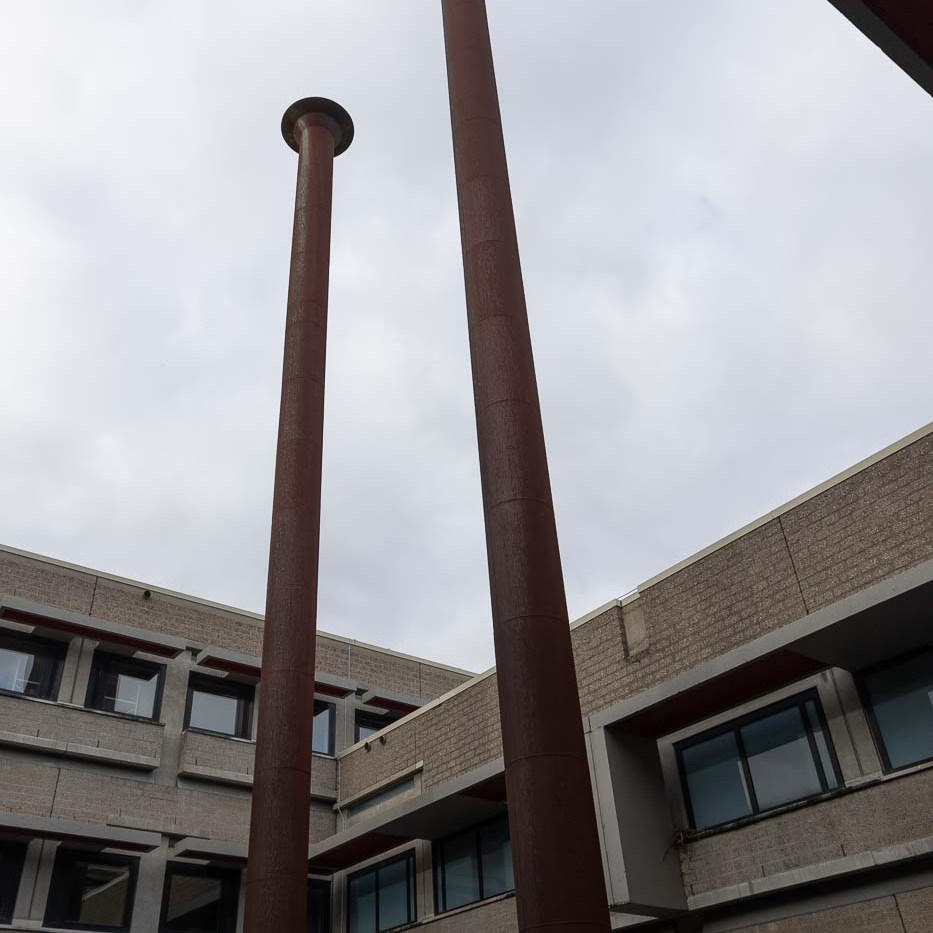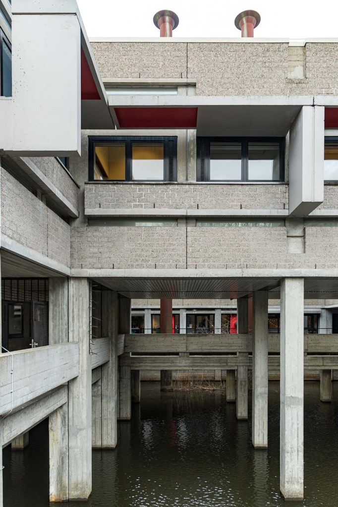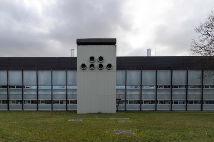 Rond de ramen zijn brises soleil aangebracht, betonnen raamlijsten die een zonwerende functie hebben. De onderkant van de ‘raamluifel’ is rood geverfd. Twee spannende schoorstenen torenen boven het gebouw uit.