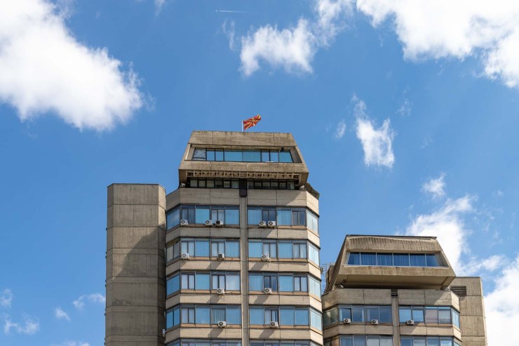 Onderweg komen we langs de Assemblee van Macedonië, het parlementsgebouw dat is gebouwd in die typische neoclassicistische stijl: zuilen, frontons en beelden van mannen die gedecideerd richting dakrand lijken te lopen. Een façade in bordkarton. Klop maar eens op de zuilen en je weet dat dit niet bepaald voor de eeuwigheid is gebouwd. De aftakeling begint direct na oplevering. Dit is de bouwstijl die je veel ziet in het centrum van Skopje, met dank aan voormalig premier Gruevski, die van Skopje een soort Disneyland aan de Vardar wilde maken. Modernistische betonnen gebouwen waren daarbij vaak het kind van de rekening. Gruevski studeerde economie aan de erg brutalistische Universiteit van Skopje. Wellicht dat zijn betonhaat daar wortel schoot.