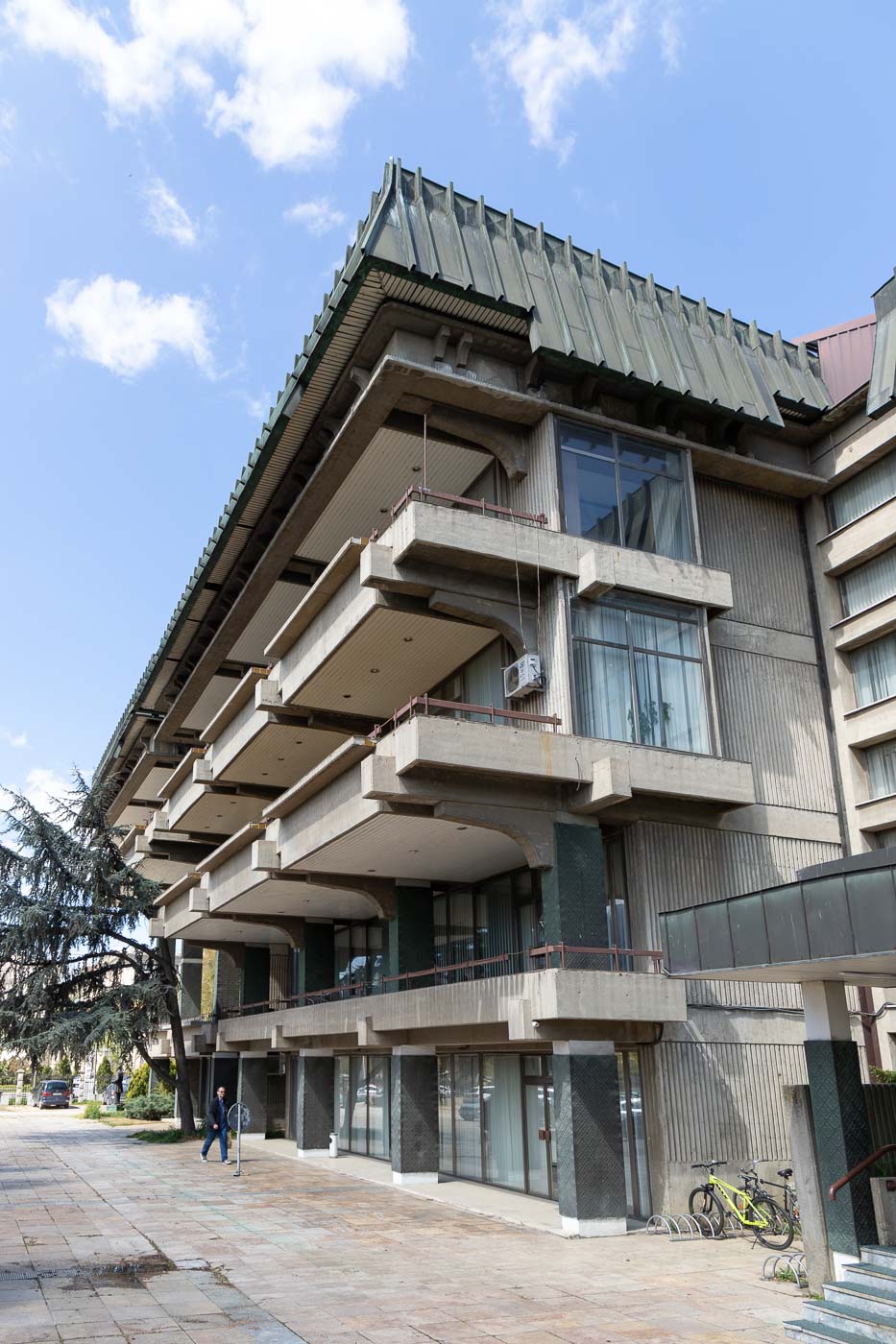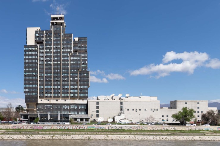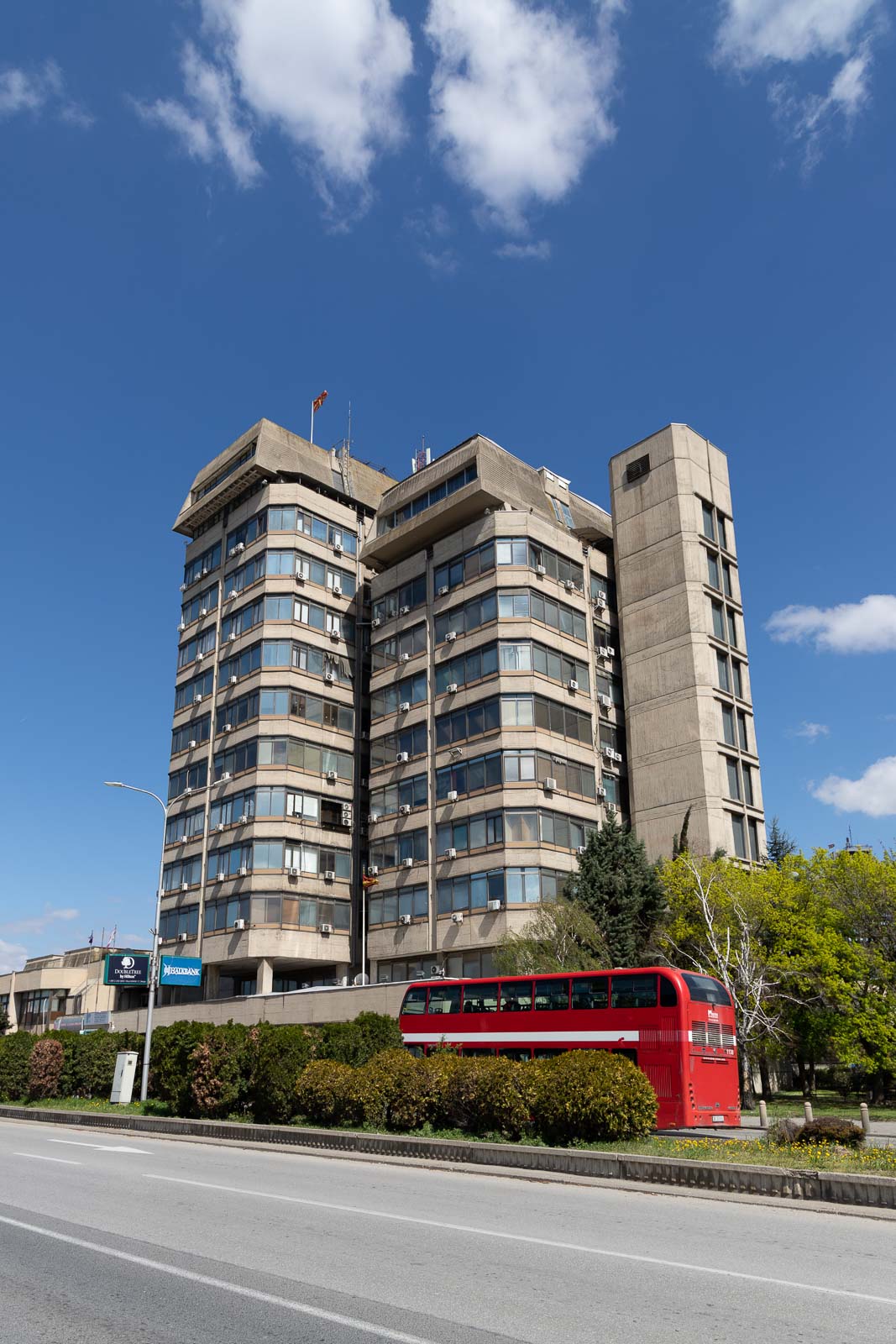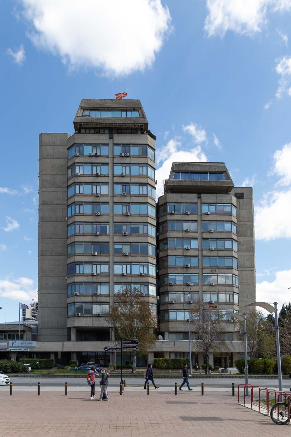 Aan de andere kant van de Vardar zie we het modernistisch ogende RTV-gebouw, dat met zijn 70 meter tot voor kort het hoogste gebouw van Noord-Macedonië was. De entree is erg bruut. Over de architect(en) is online enige verwarring. Kiril Acevski wordt meestal genoemd, maar ik kom ook Josikovski en Manov tegen. Dan noem ik ze maar allemaal bij de snelle feiten.