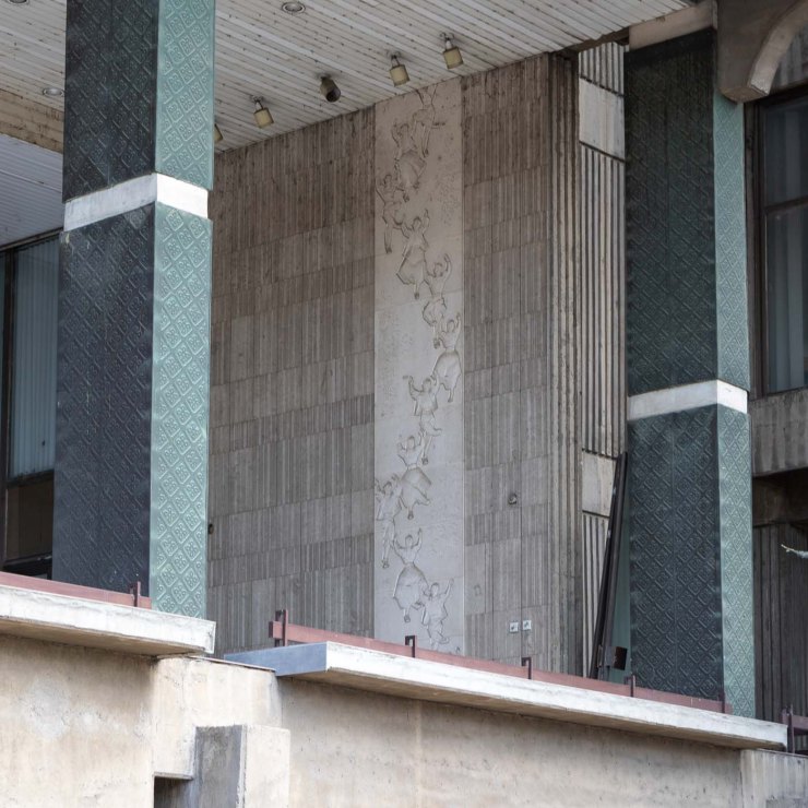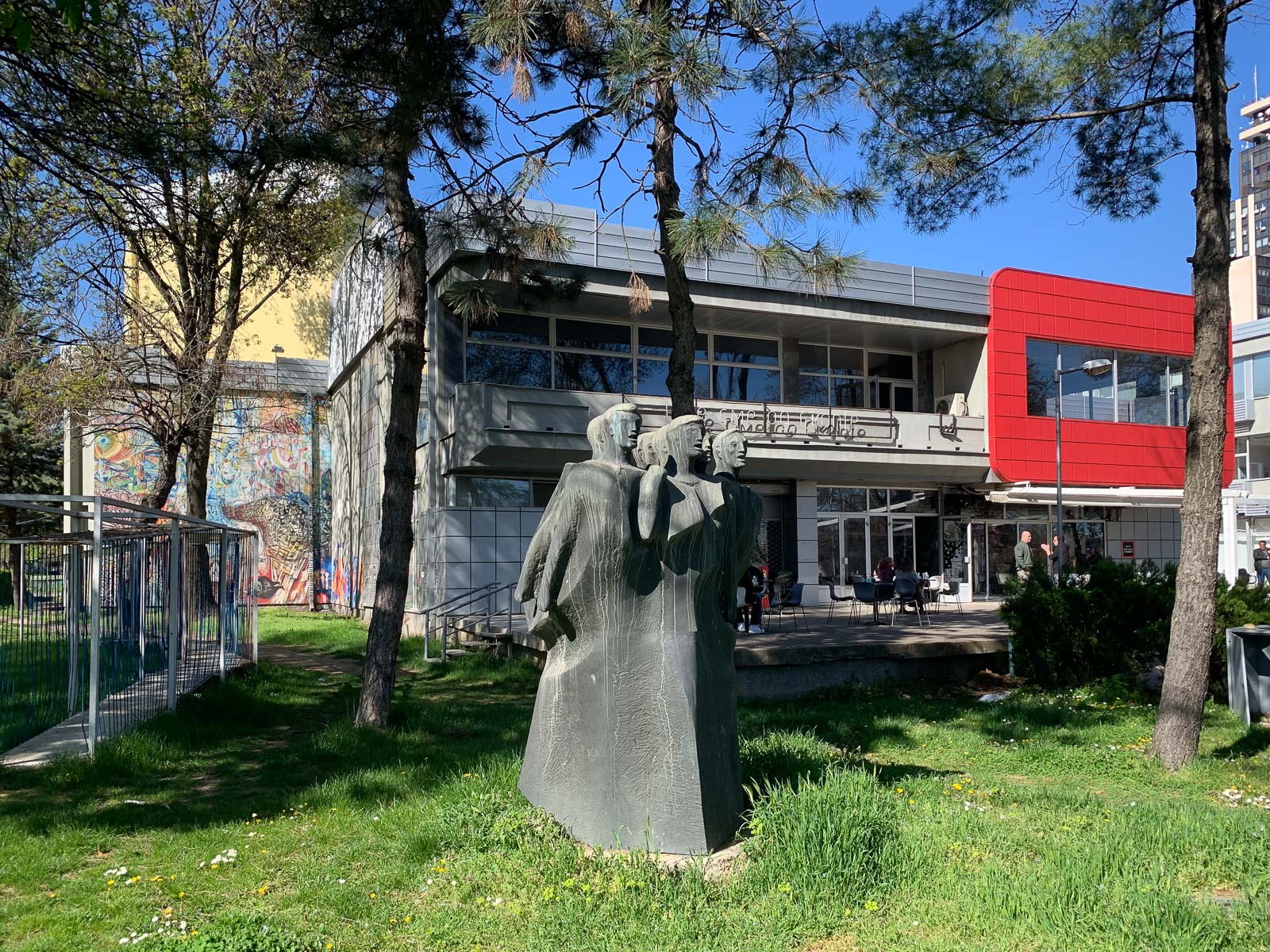 Het Cultureel Jeugdcentrum (NMK) is ook zo’n fraai modernistisch gebouw. Er zit een fijn café-restaurant in en een aardige platenzaak. Je kunt er ook leuke brute Skopjeparafernalia kopen. De trappenhuizen en balkons zijn prachtig, voor de entree staat een ouderwets yugsocreal beeld: monumentaal Joegoslavische socialistische realisme.