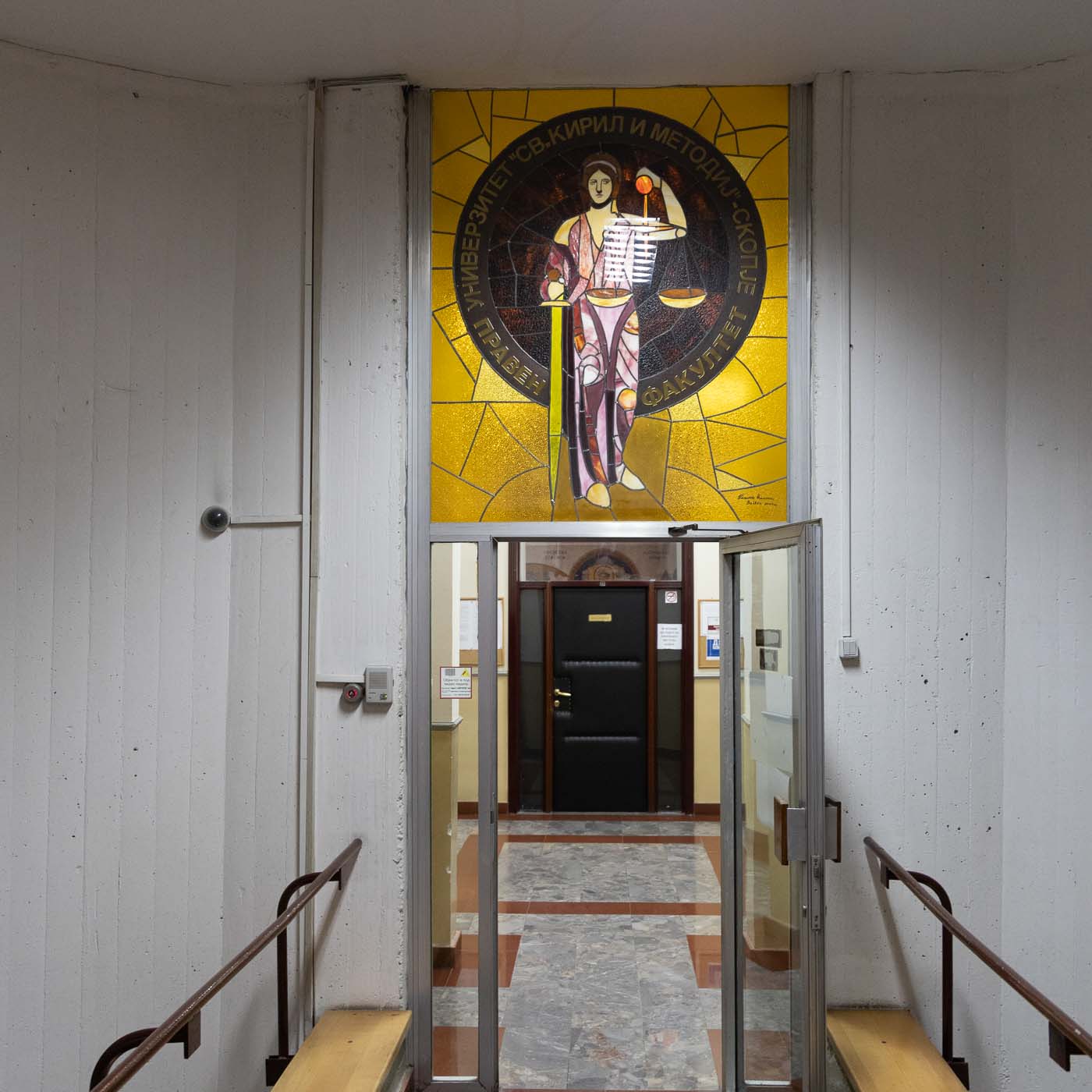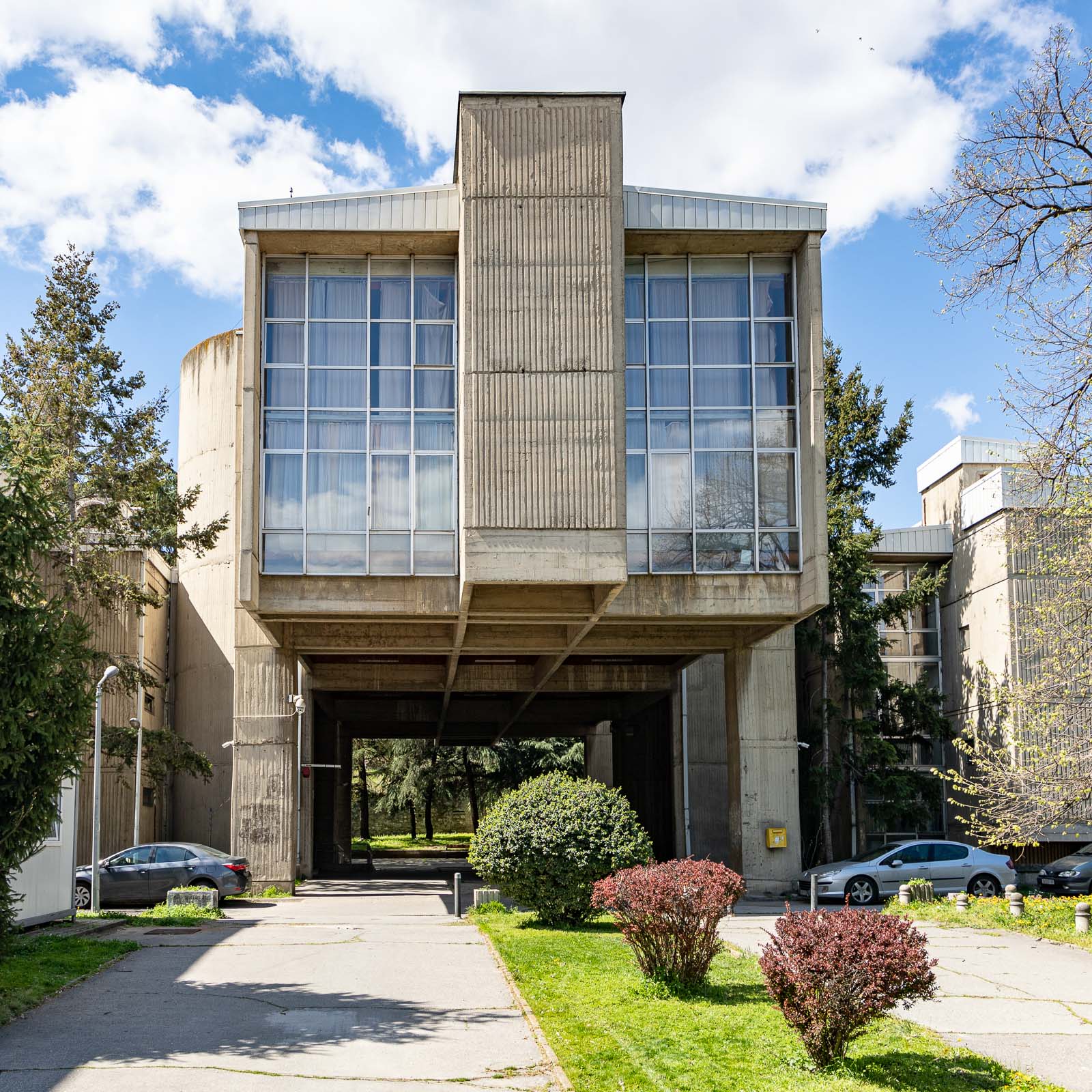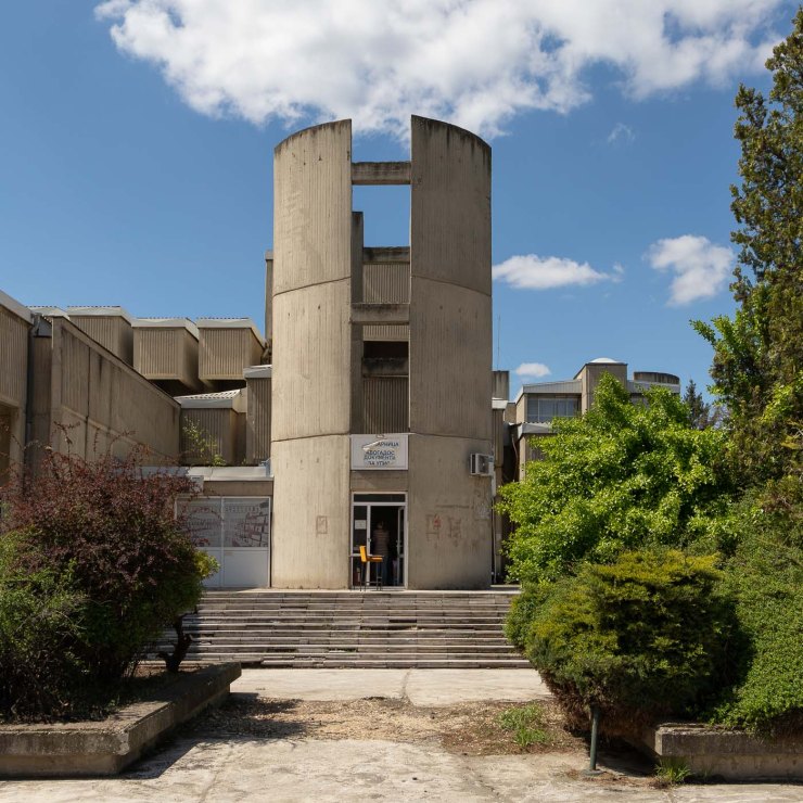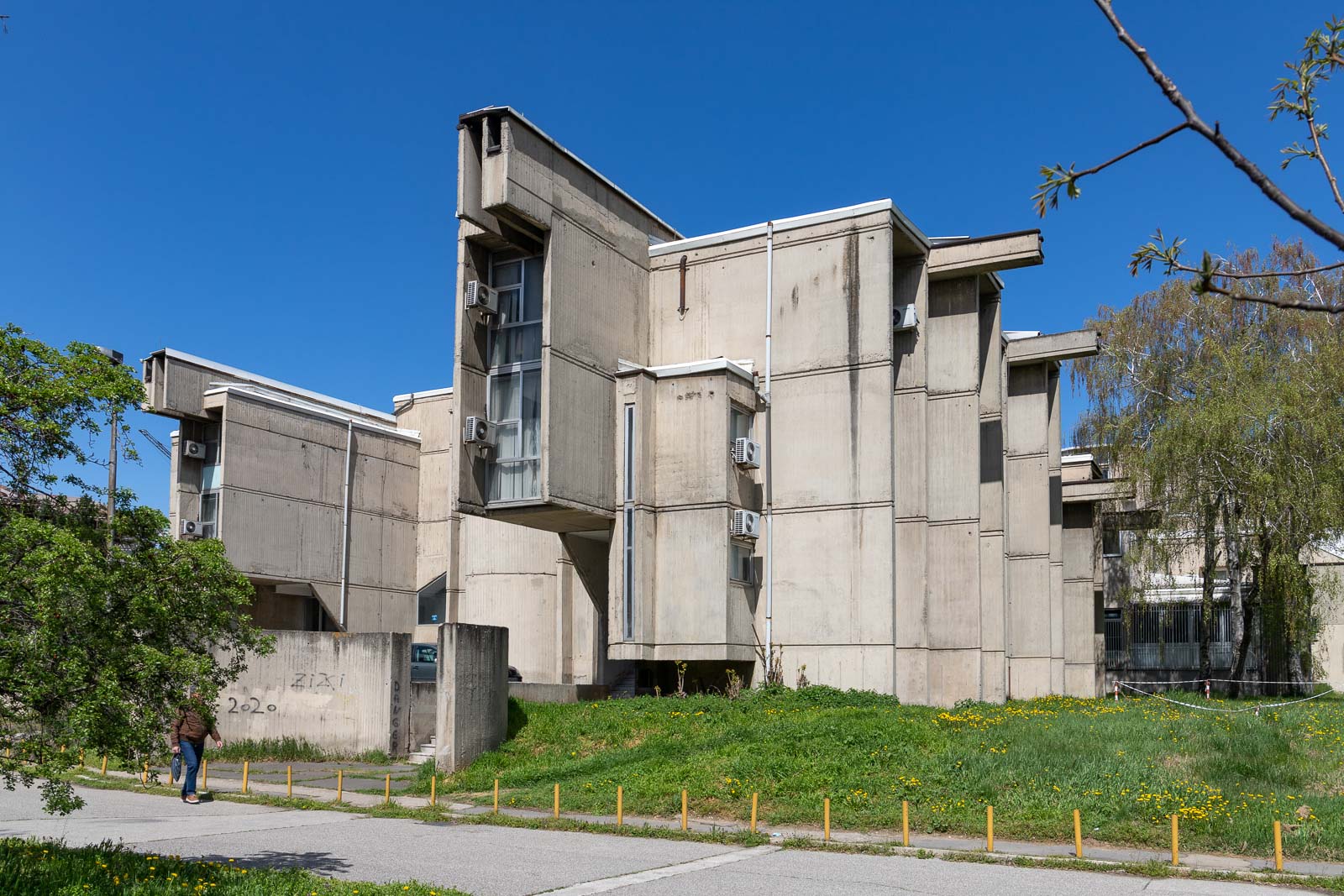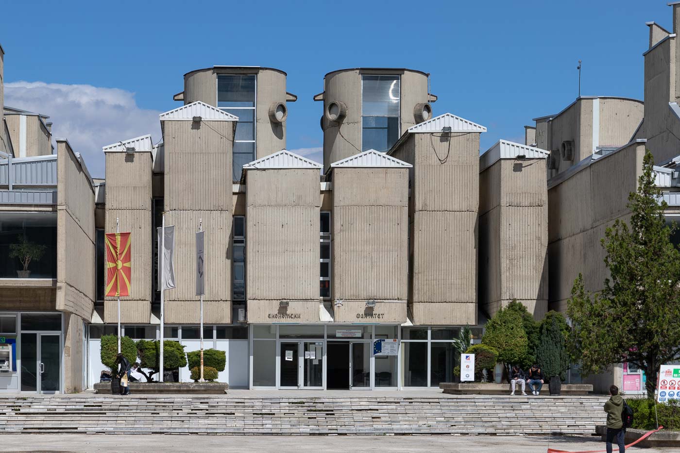 De Universiteit van Sint Cyrillus en Methodius is een spectaculair Betonfest. Vier bouwvolumes zijn opgetrokken rond een centraal betonnen plein, waarvandaan brede trappen naar de entree van de drie faculteiten leiden: rechten, filosofie en economie. Via een poort onder het administratiekantoor door, waar de rector huist, kom je op het plein uit. In materiaalgebruik lopen exterieur en interieur vloeiend in elkaar over: het is béton brut wat de klok slaat, binnen wit geverfd, buiten onbewerkt, ruw, onopgesmukt.