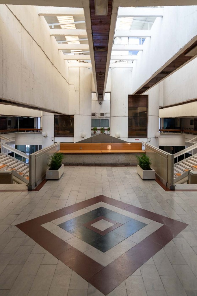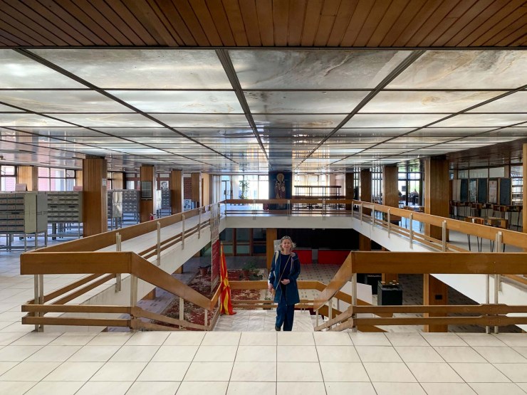 Ook hij is trots op zijn gebouw, waar het nog steeds erg leeg is omdat de studenten sinds corona liever vanuit huis werken. Het interieur oogt luxe, seventies Yugo chic: veel marmer, glas in lood, niet werkende fonteinen en allerlei bijzondere details. Op de marmeren vloer is met een subsidie van een miljoen een geleidestrook aangelegd die onhandig dicht langs zitjes loopt en onhandig hoge gele ribbels heeft waar je prima over kunt struikelen. Goed reinigen van de vloer is hierdoor niet meer mogelijk, zo verzucht de decaan. En dat voor de gesubsidieerde toegankelijkheid van drie studenten met een visuele handicap in de afgelopen tien jaar.