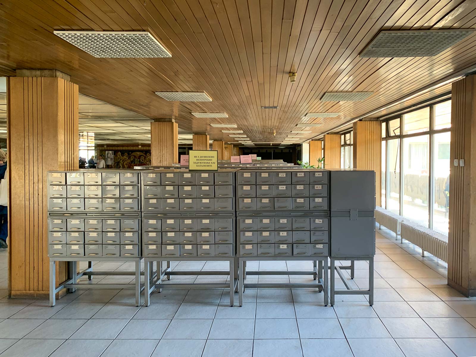 De beveiliger van de universiteitsbibliotheek is maar wat trots op zijn gebouw. Hij opent de deur voor ons en leidt ons rond. Voor het interieur is weer behoorlijk uitgepakt. Plafonds met parelmoerachtige lichtbakken, veel marmer en verfijnd houtwerk. Ook in dit gebouw gaan modernisme en traditionalisme (folklore) hand in hand. De archiefkasten en kaartenbakken ogen lekker ouderwets, net als de originele zichtkasten met het mooiste uit de collectie.