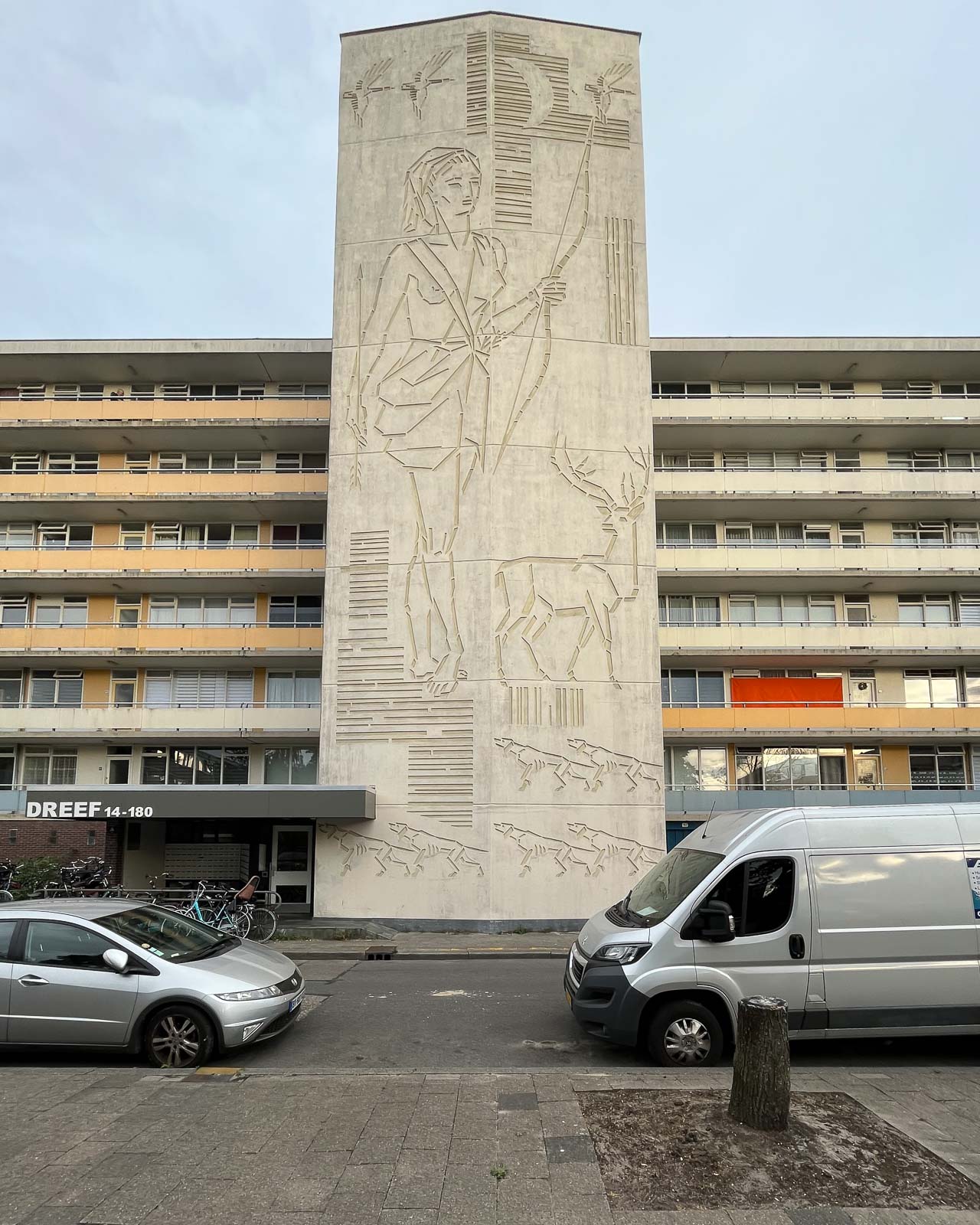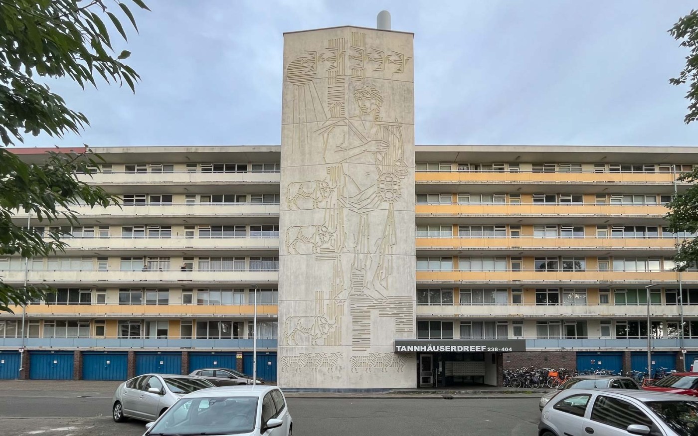 Vlakbij station Overvecht staat aan de Tannhäuserdreef een flat van 250 meter breed bij zes verdiepingen hoog met per lift bereikbare galerijen. De flat uit 1964 is snel en goedkoop gebouwd in gietbeton naar ontwerp van Albert van Overhagen. Tot zover weinig reden om er te gaan kijken. De twee liftkokers met daarop twee enorme betonreliëfs zijn dat zeker wel.