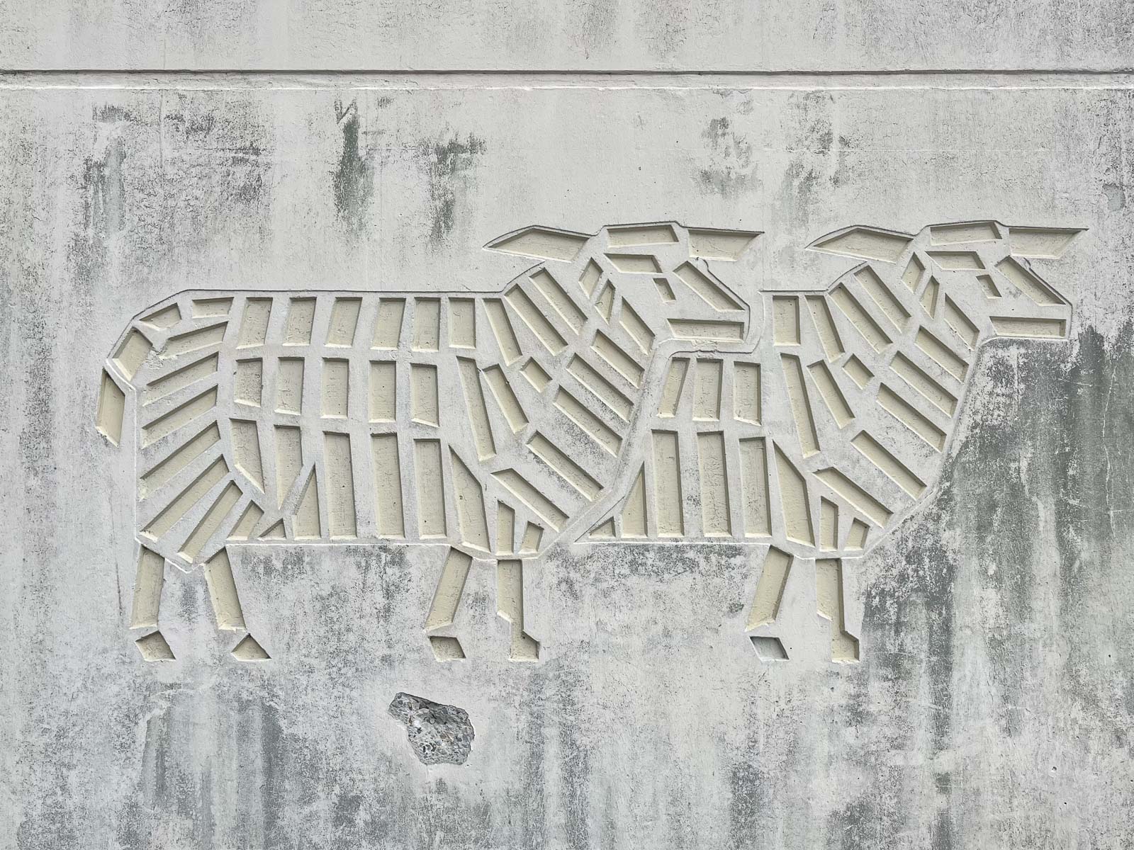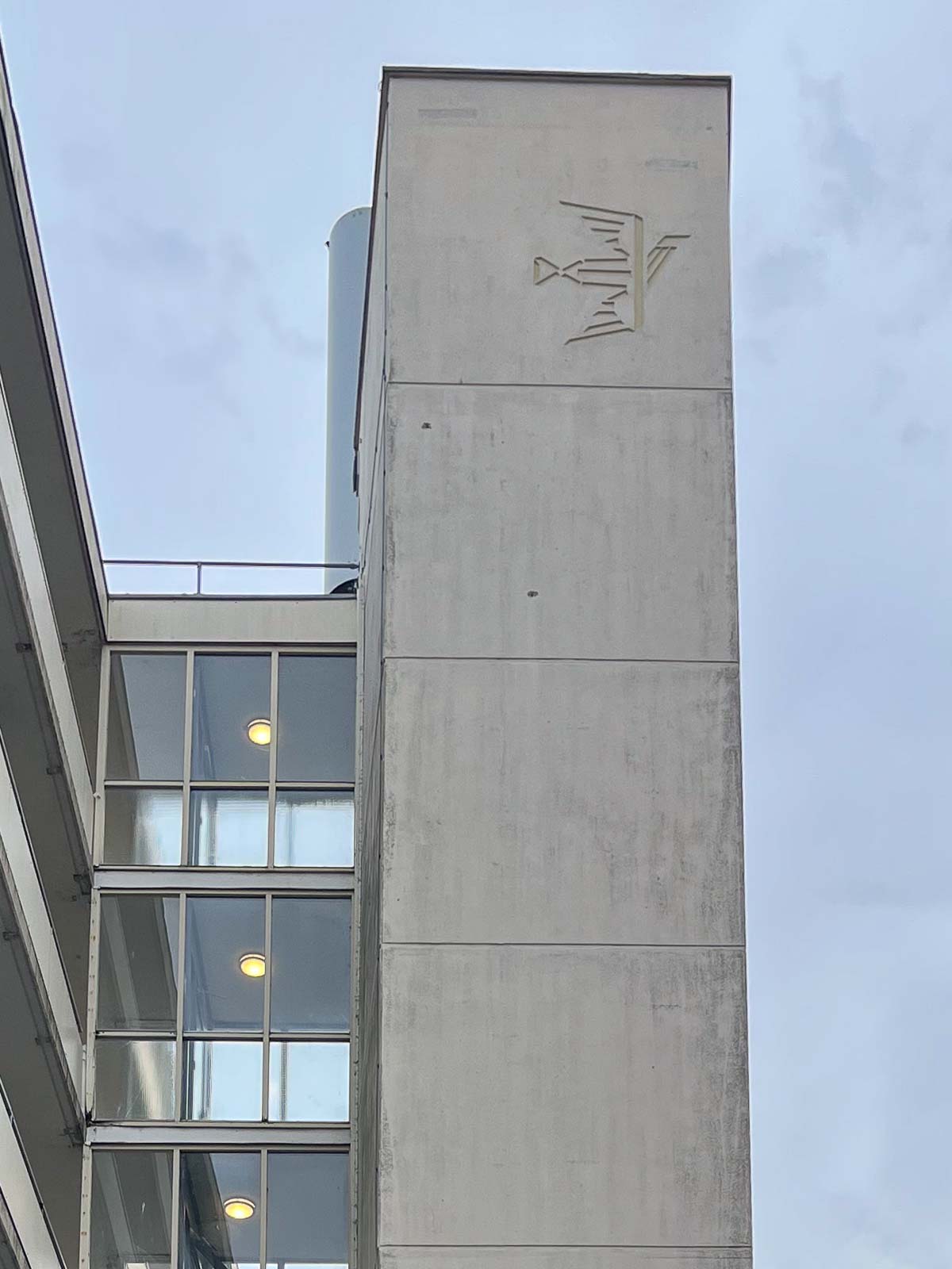 De reliëfs zijn gemaakt door kunstenares Romualda Bogaerts-Van Stolk en beslaan de gehele hoogte en breedte van beide liftkokers: 20 bij 8 meter. Aan de horizontale naden kan je zien dat de reliëfs etage voor etage in beton zijn gegoten, in een subtiele houten bekisting. Het is bijzonder knap hoe met dit minimalistische principe – voornamelijk rechte lijnen zodat het ontwerp te ‘bekisten’ en ‘gietbaar’ is – zoveel wordt uitgedrukt. In der Beschränkung zeigt sich erst der Meister.