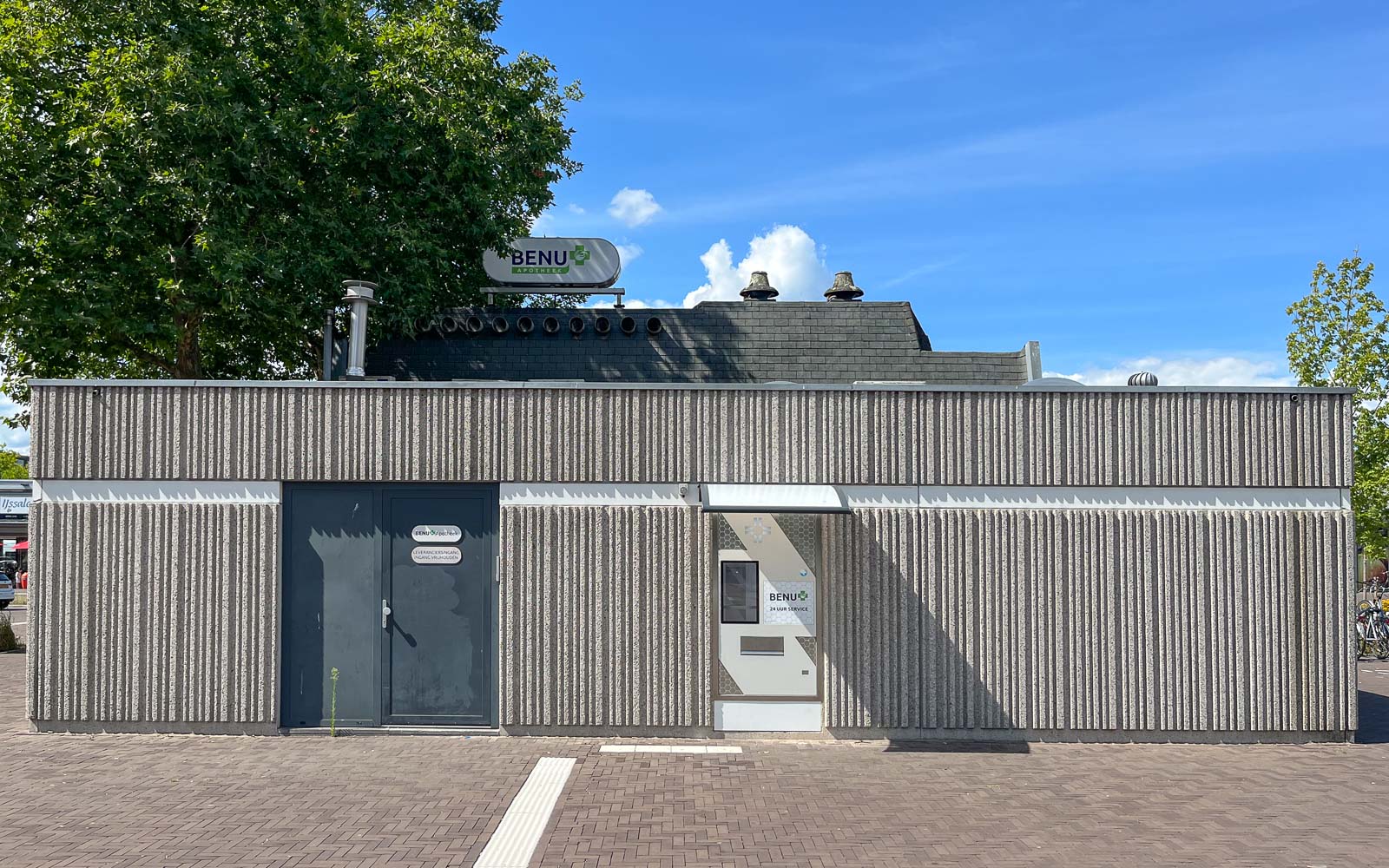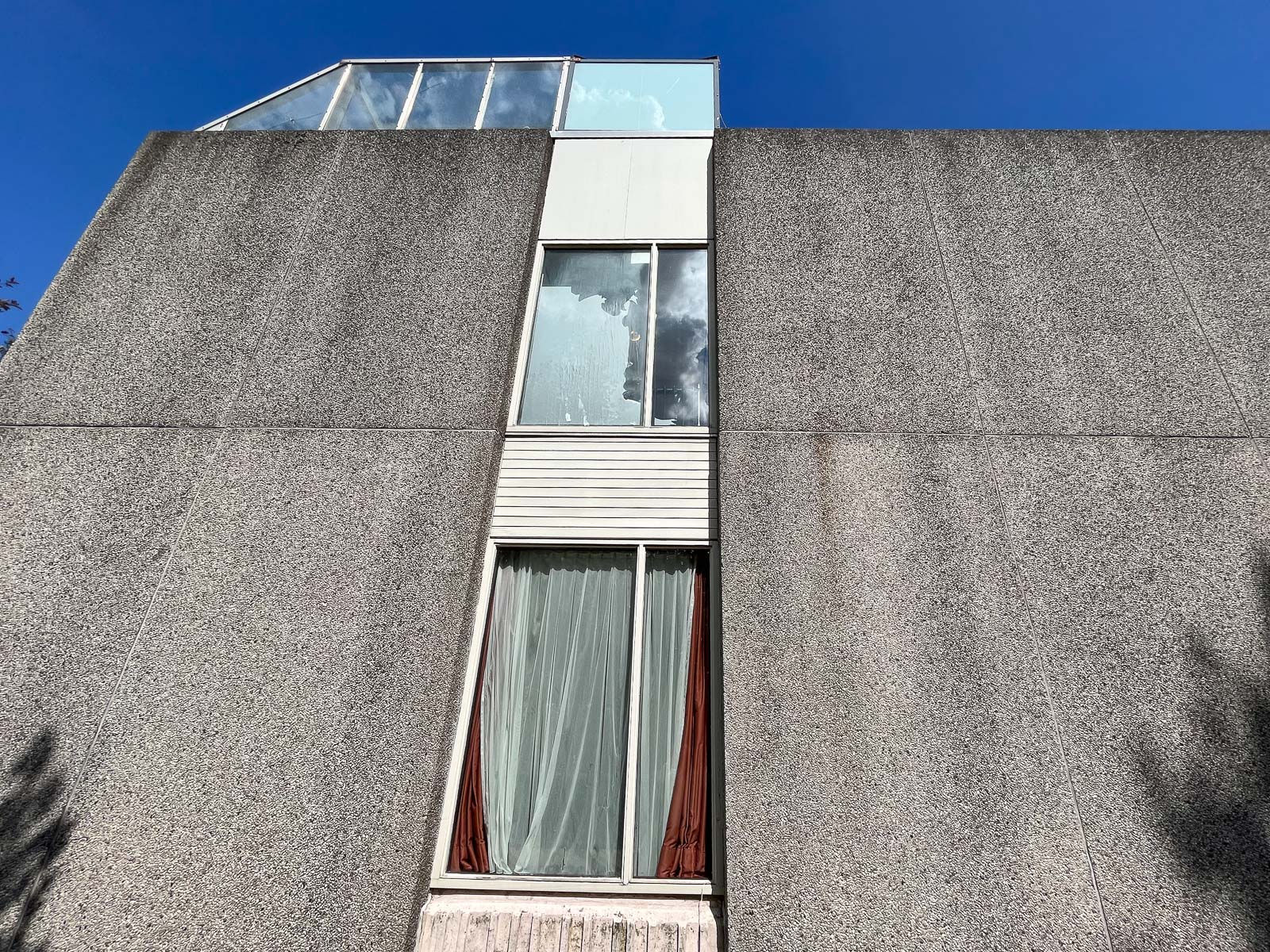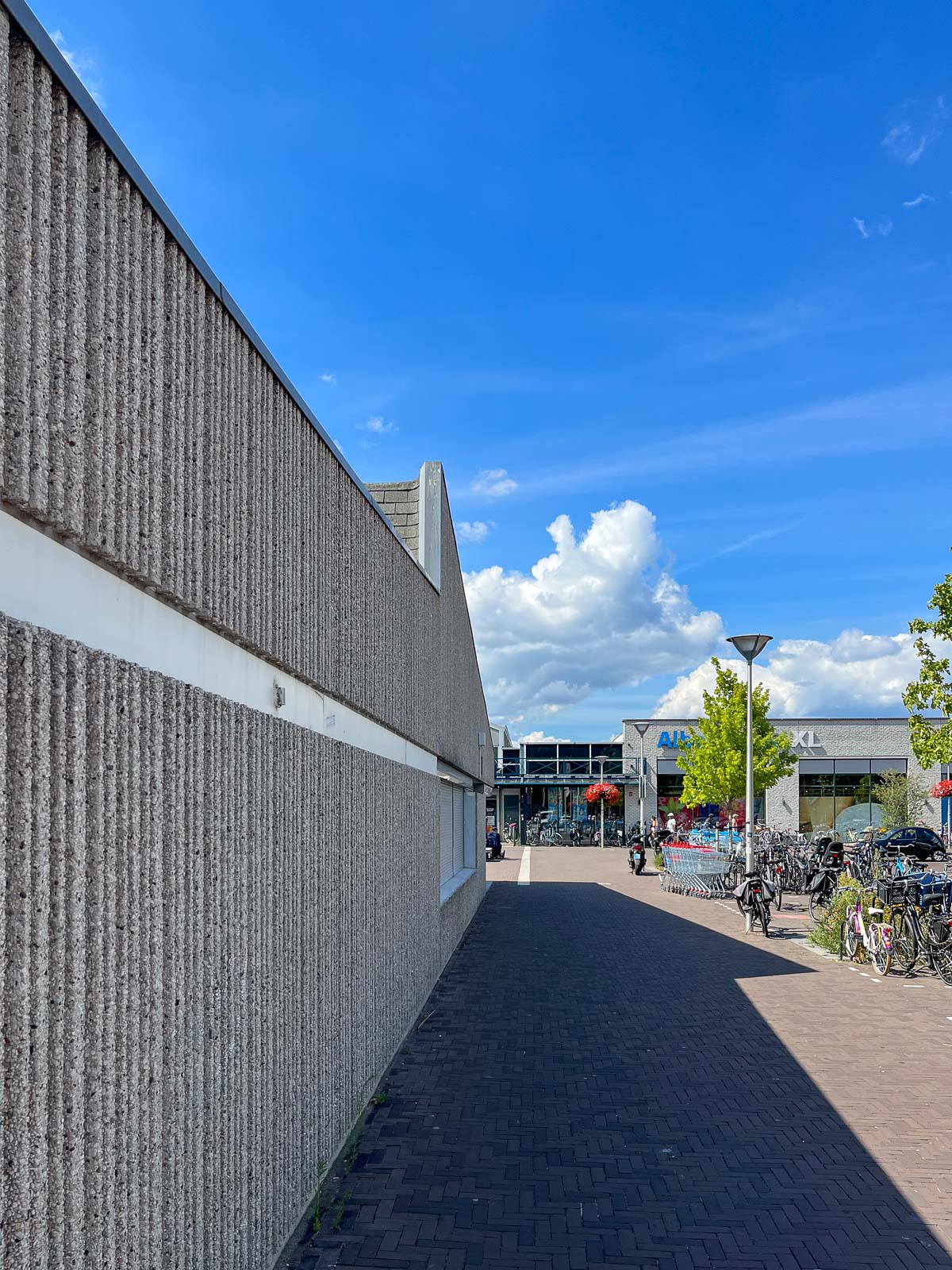Bij het vroegere Grootwinkelcentrum Overvecht, dat tegenwoordig Shoppingcenter Overvecht heet, vind je de BENU Apotheek. Deze voormalige apotheek van de Onderlinge Pharmaceutische Groothandel (OPG) is een opvallend onopvallend gebouw. Ik ben er al honderden keren langsgefietst, maar deze vreemdvormige apotheek met zijn sculpturale jas in beton met diepe ribbels is mijn toch redelijk geoefende brutalistische oog nooit eerder opgevallen. Een tip van Arjan den Boer, partner in Bruut, ofwel een van de medeschrijvers aan onze atlas van brutalistische architectuur in Nederland.
