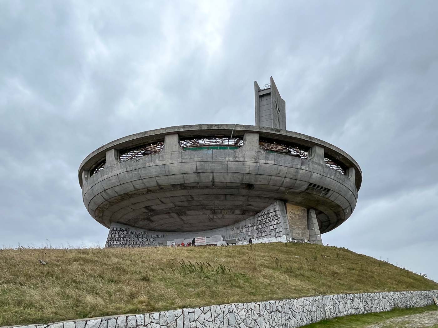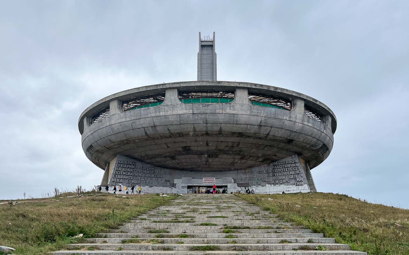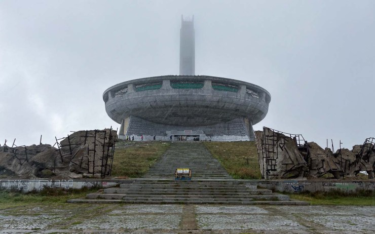 Een bucketlist heb ik niet, maar had ik die dan stond het Buzludzha Monument van Bulgarije hoog op de lijst. Vorige week ging ik er langs. En ja, Buzludzha is zeer bucketlistwaardig. Het is een van de grootste indrukwekkendste idiootste relicten uit vervlogen socialistische tijden. De vliegende schotel met losse toren staat op een forse berg, Buzludzha, die oorspronkelijk 1.441 meter hoog was maar waar met dynamiet 9 meter is afgeknald om een mooi vlak plateau te creëren voor het bouwsel. Het Buzludzha Monument is op deze plek gebouwd omdat hier de basis werd gelegd voor de Communistische Partij van Bulgarije. Het is een gigantisch karwei geweest om alle materialen en werklieden de berg op te krijgen. De bouw duurde zeven jaar.