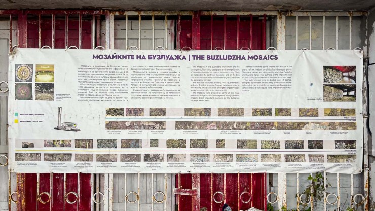 Ook de in twee ringen geplaatste mozaïeken moeten prachtig zijn geweest. Ze beslaan in totaal bijna 1000 m² en er zijn 2 miljoen mozaïeksteentjes in verwerkt. Het plafond was bekleed met een enorme hamer en sikkel met daar omheen de bekende kreet ‘proletariërs aller landen verenigt u!’ Daar is nog maar een klein deel van over. Ook de beeltenissen van Marx, Engels en Lenin zijn in mozaïek gevangen, net als die van hun Bulgaarse secondanten en natuurlijk de Bulgaarse partizanen.