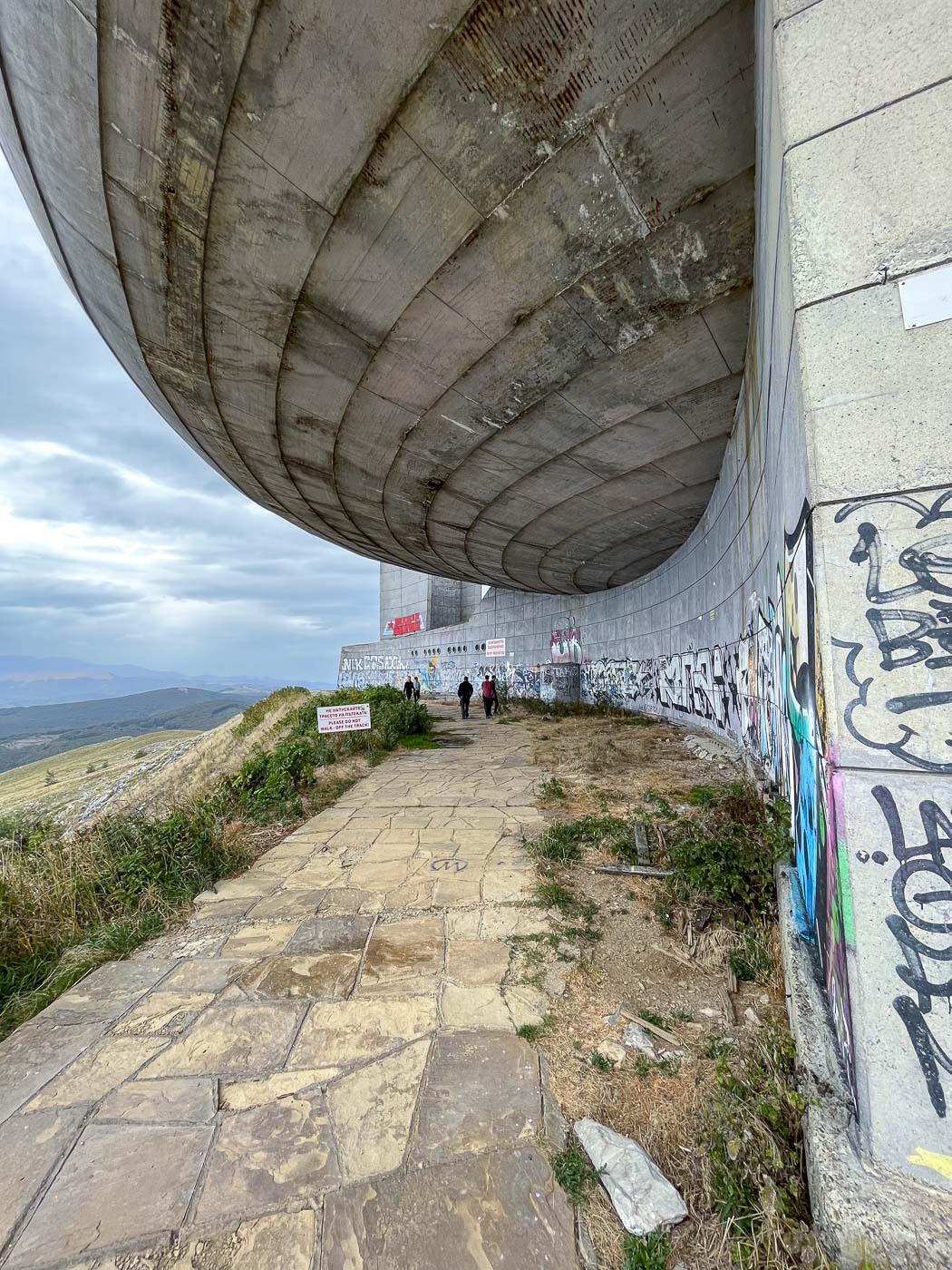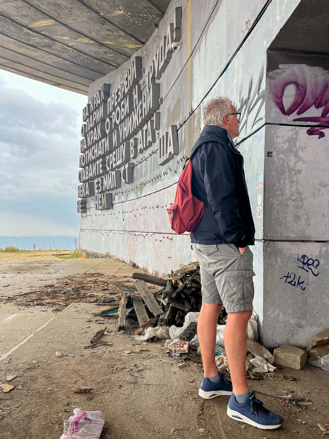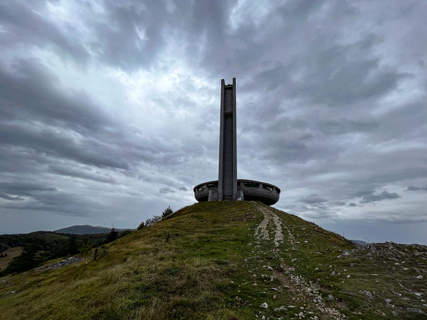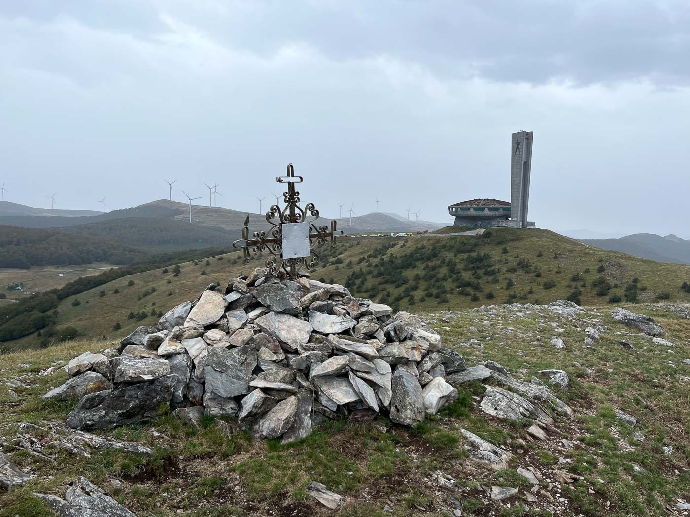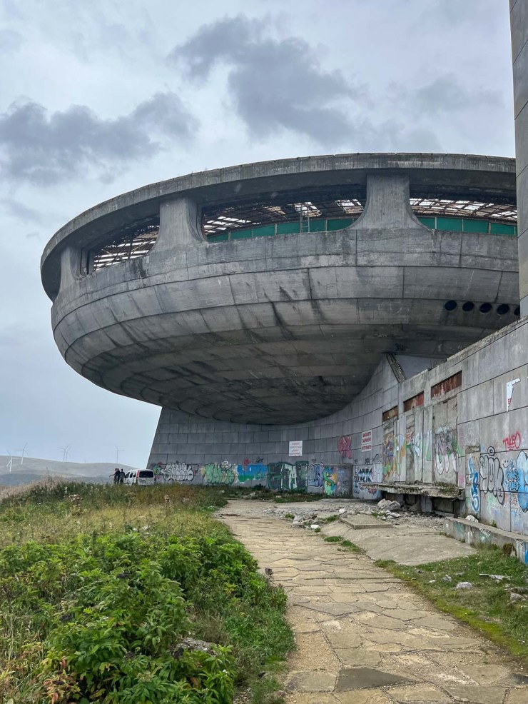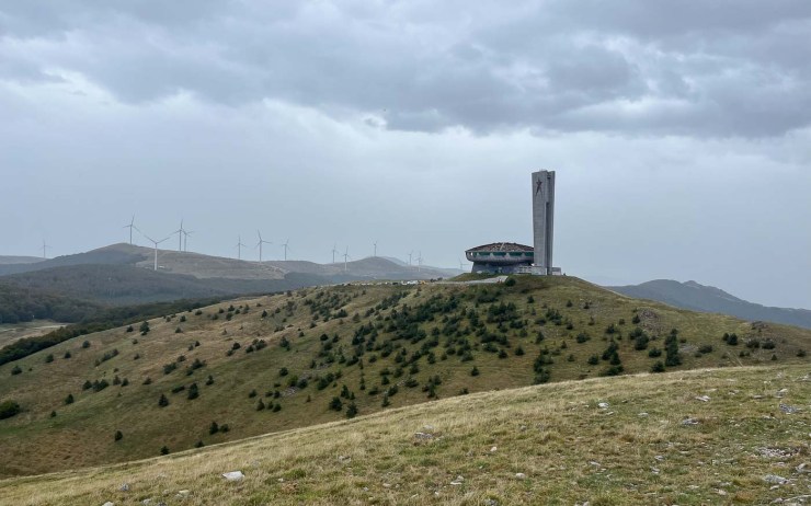 De naam Buzludzha komt van het Turkse woord ijzig. Dat is niet voor niets: de wind heeft op deze hoge kale top vrij spel en de temperatuur kan in de winter zakken tot min 25 graden. Buzludzha is ook een skigebied. Als wij er zijn, is het spannend weer. We beginnen ons bezoek met regen, tussendoor is het even oké en we eindigen met een diagonale stortbui. Je kunt op Buzludzha mooi wandelen. Het is een bevreemdende berg met zijn socialistische monumenten en aangrenzend een windmolenpark.