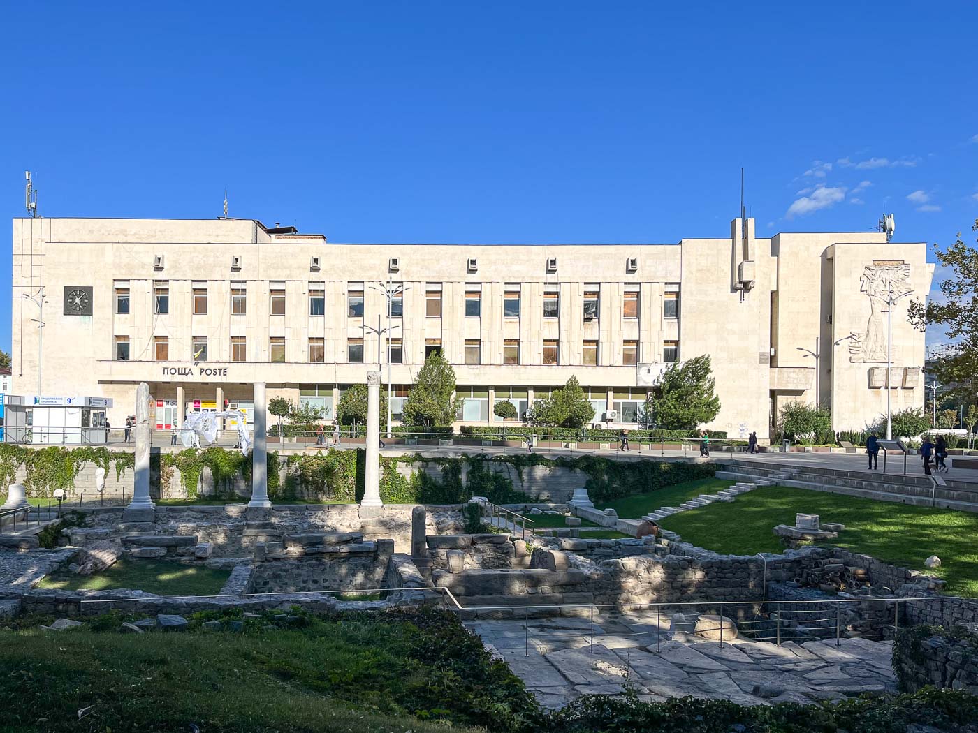 Het Hoofdpostkantoor van Plovdiv is een enorm multifunctioneel gebouw in het centrum van de stad. Tijdens de bouw werden overblijfselen gevonden van het Forum van de Romeinse stad Philippopolis, die je ook kunt bezoeken. Het interieur van het Postkantoor is versierd met veel houtsnijwerk, de verticaal aan de pilaren geplaatste radiatoren hebben bijpassende beschermende roosters en ook de plafonnières zijn mooi versierd, wat detoneert met de plafonds waaraan ze bevestigd zijn. Plafonds die in staat van ontbinding verkeren en met hardboard en andere knip- en plakoplossingen bij elkaar worden gehouden. De uiterst ruim opgezette lobby heeft een glazen plafond en een groot mozaïek met drie duiven. Voor de liefhebbers: er is ook een postzegelkiosk, maar de oorspronkelijke loketten zijn helaas gesloten.