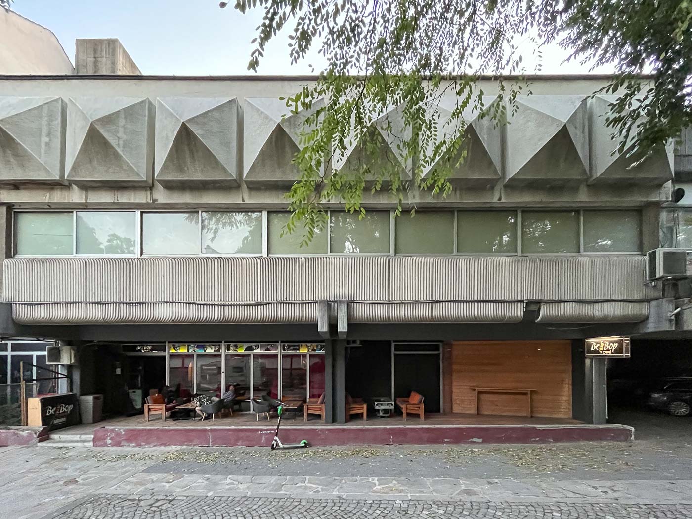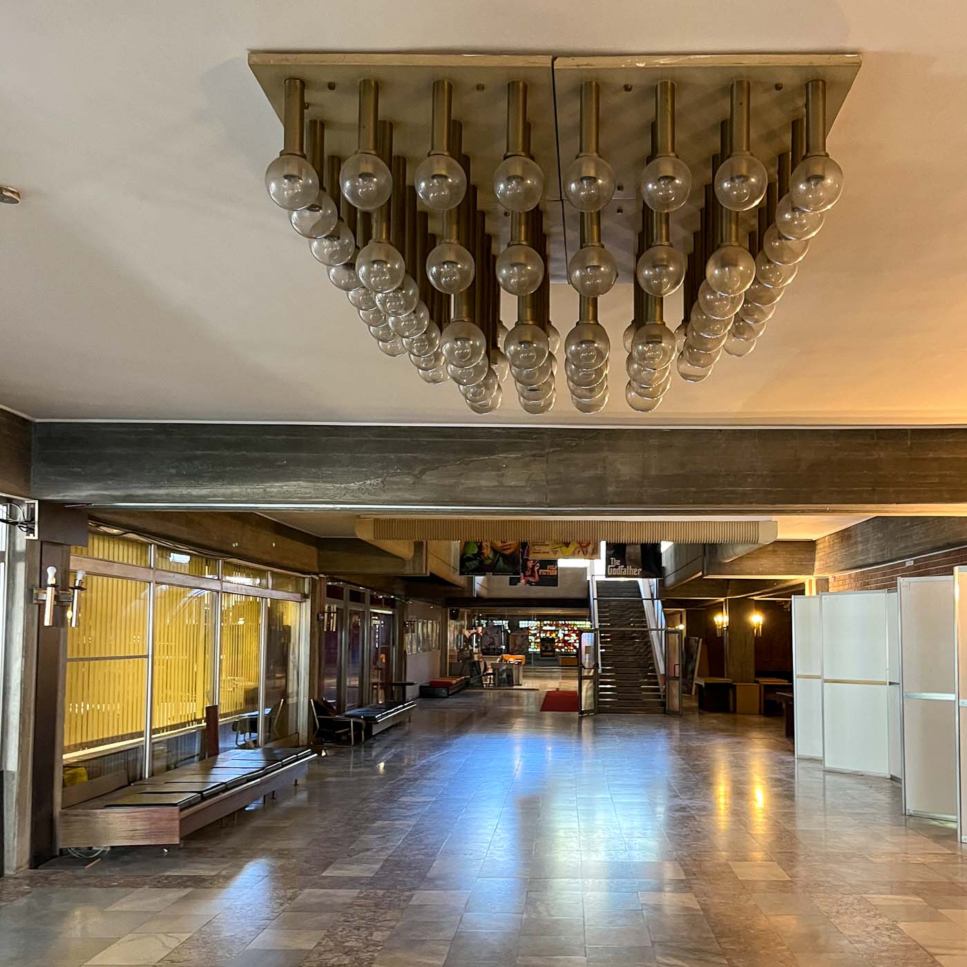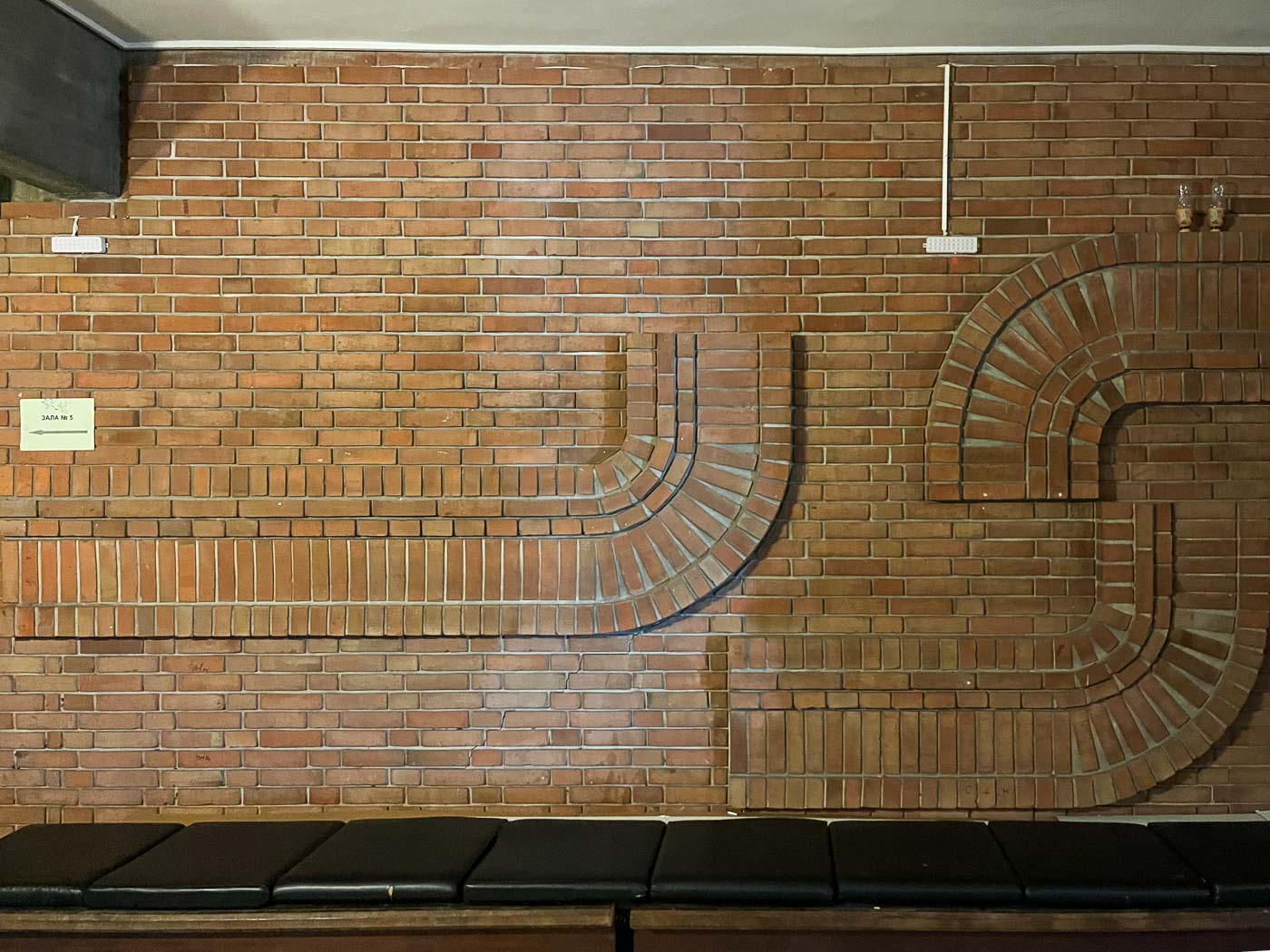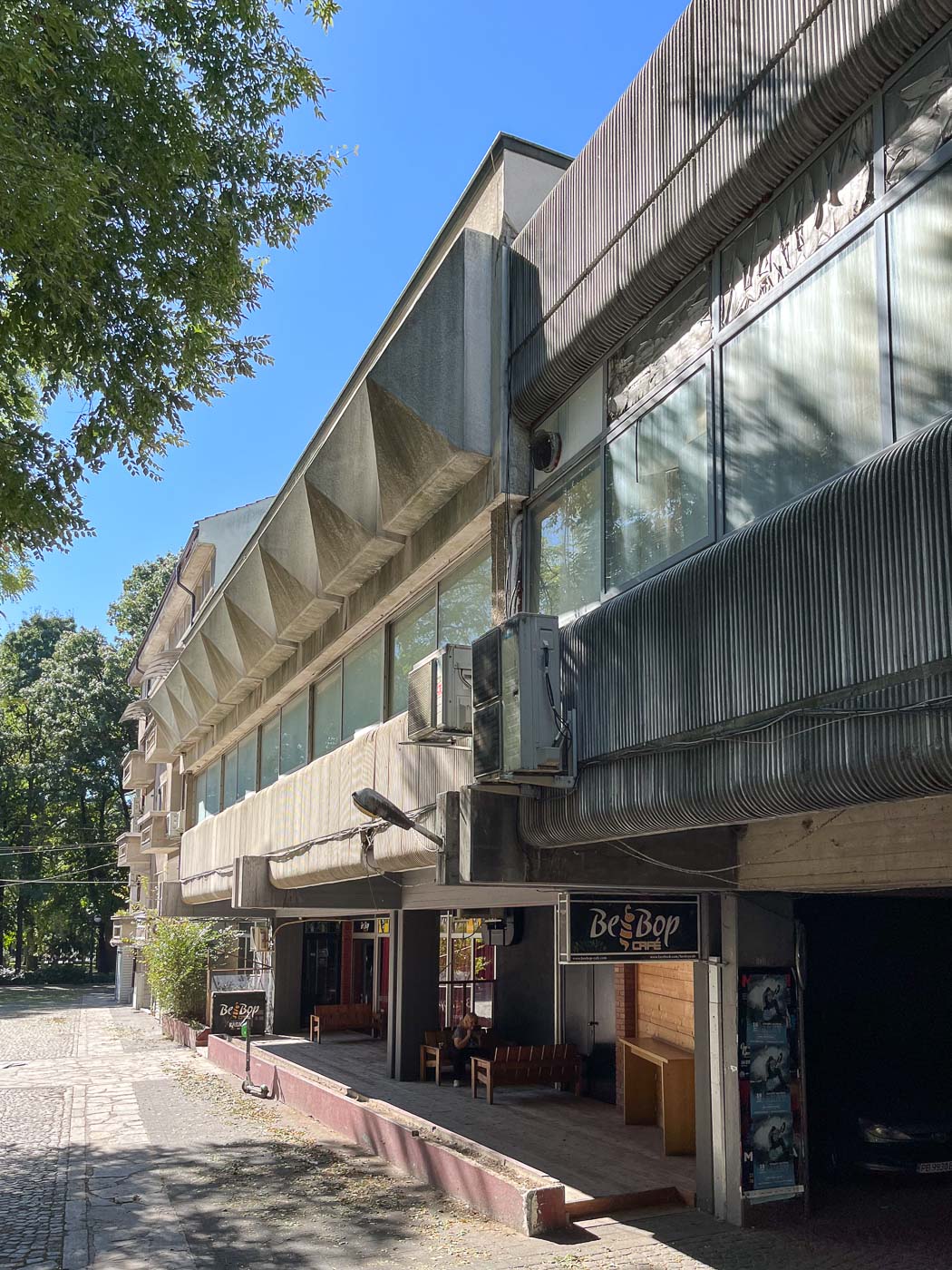 Het interieur is om van de smullen. De achterwand van de benedenverdieping is opgebouwd uit kleurige glasstenen. Er zijn baksteenreliëfs te zien en de plafonds zijn vergeven van de typisch Bulgaarse kroonluchters die me doen denken aan die van het Kulturpalast van Sofia. De meubels lijken me origineel en zeer eighties verantwoord, de lichtkokers met de betonnen baleinen zijn geweldig. De bovenste verdieping is van buiten bekleed met weer die typisch Bulgaarse driedimensionale wybertjes van beton. Als je in Plovdiv bent, moet je hier zeker even naar binnen. Al was het maar voor een glas Bulgaarse wijn in Club Fargo.