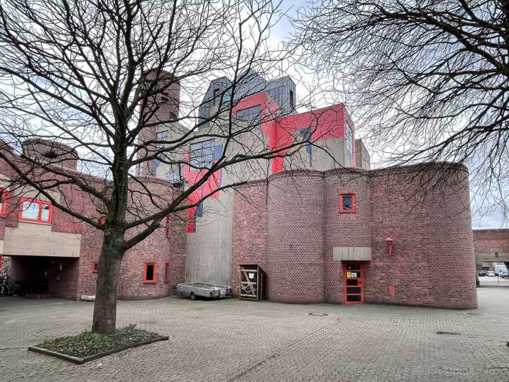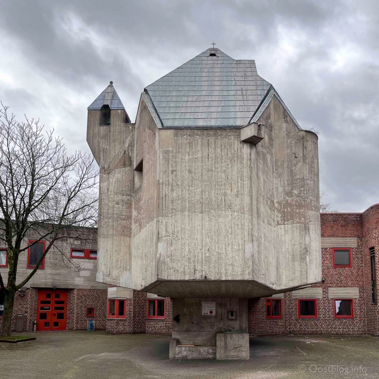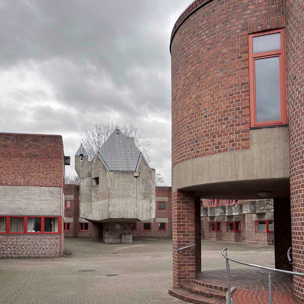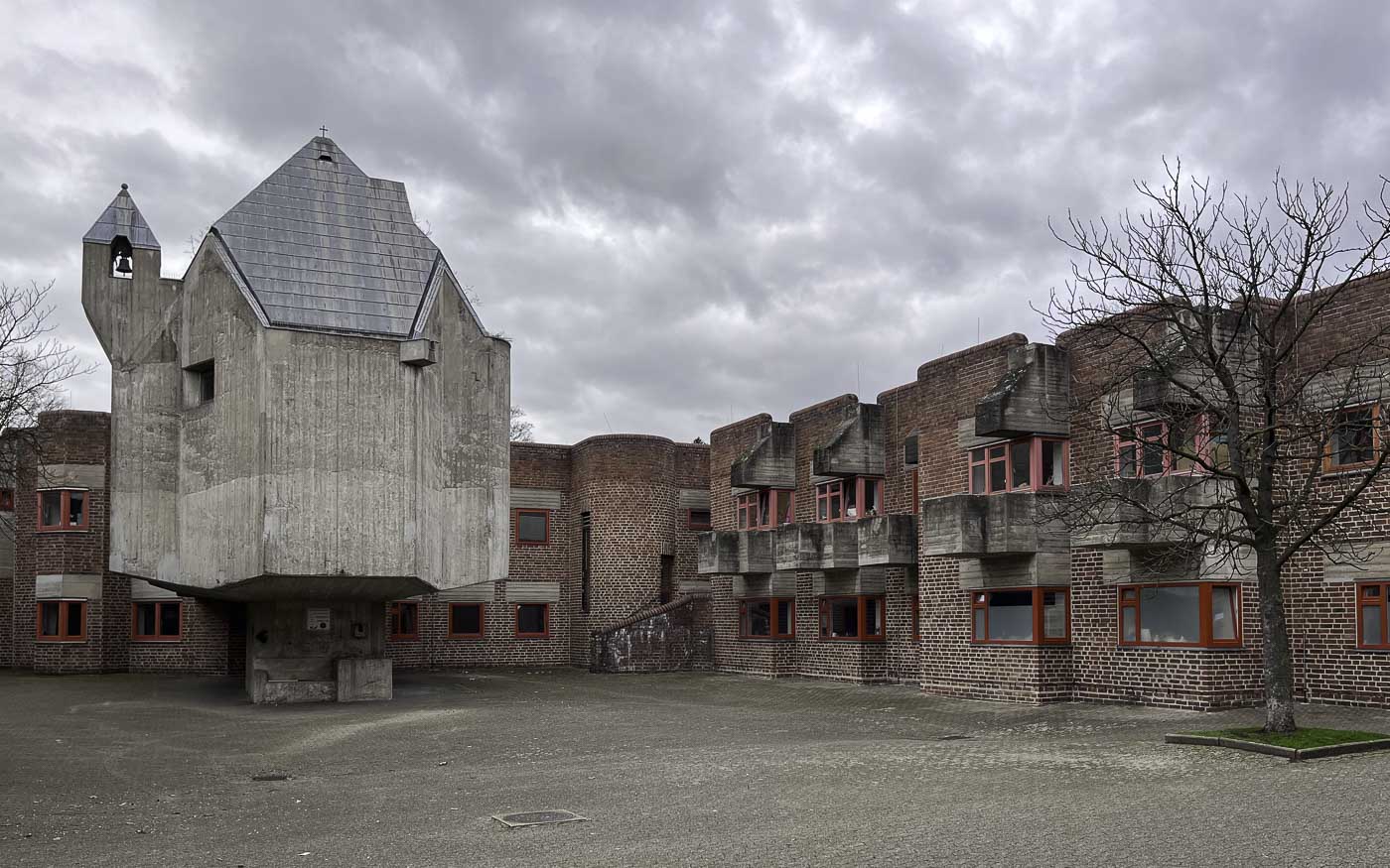 Gottfried Böhm ontwierp dit stedenbouwkundig ensemble van kerk, kapel en bejaardentehuis. Böhm combineerde zichtbeton en baksteen om zijn basisidee, een ontwerp volgens de plattegrond van een middeleeuwse stad, in een brutalistische jas te gieten. De twee verdiepingen hoge woningen van het bejaardentehuis vormen een kasteelmuur met ronde hoektorens en poorten, de betonnen balkons en uitsteeksels lijken op kantelen.