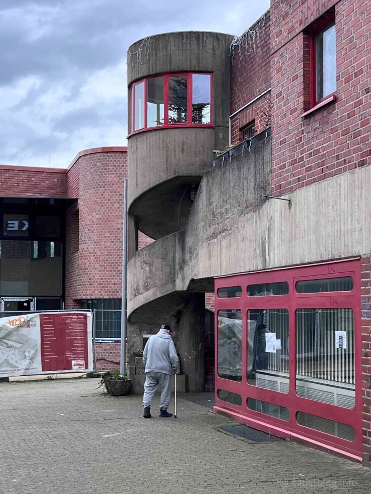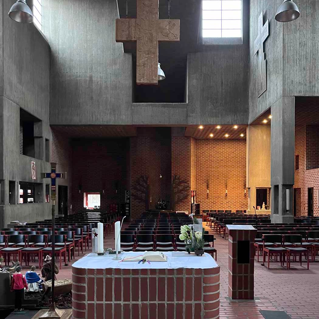 Achter de kerk bevindt zich een treurig noodlijdend winkelcentrum, om de hoek bij een welgevormde betonnen wenteltrap. Daar wordt ook gebouwd aan de nieuwe pastorie die qua ontwerp prima past bij het ensemble. De nieuwe pastorie werd ontworpen door Büro Gottfried Böhm, waarvan de naamgever in 2021 overleed op de voor een kerkenbouwer en mens gezegende leeftijd van 102 jaar.