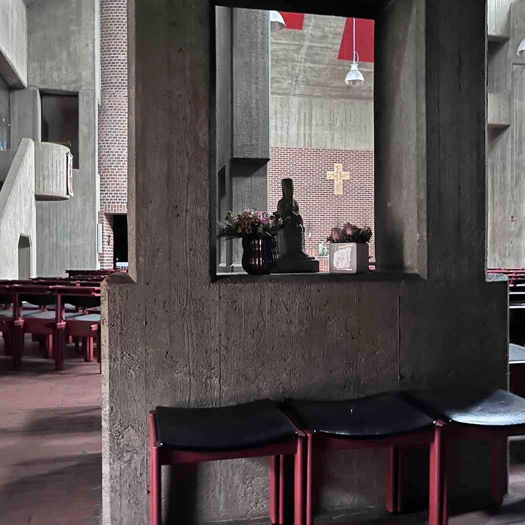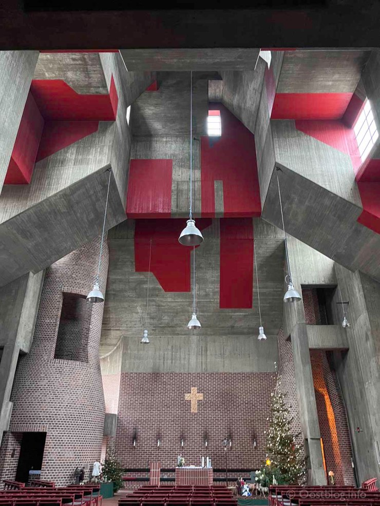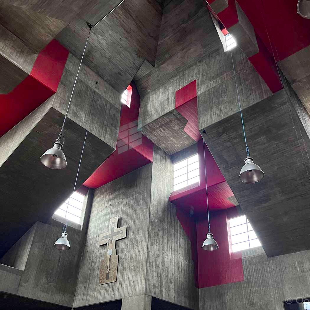 De kerkdeur is ‘los’. We gaan naar binnen. Een man blaast de kaarsen uit die voor de nieuwjaarsdienst zijn ontstoken. Hij maakt daarbij gebruik van een allerhandigst blaasinstrument met een bolletje als van een toeter. De kerk is een bizarre asymmetrische mengelmoes van materialen, kleuren en vormen: geneste massieve betonnen kubussen, onregelmatig gerangschikte kegels, ronde ‘kasteeltorens’ in baksteen.