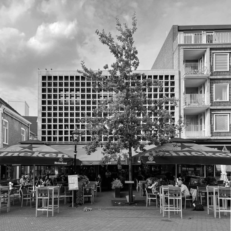 In ons eind mei te verschijnen boek Bruut: atlas van brutalisme in Nederland staan de 100 bruutste gebouwen van Nederland. In onze zoektocht naar de achtergronden van deze gebouwen doken we online en offline archieven in, vroegen we bouwdossiers op en pluisden we stapels boeken en kranten uit. Dat zoekwerk leverde voor veel gebouwen een overload aan informatie op, maar soms was het heel lastig om informatie te vinden. Brink 14 te Assen was zo’n hard te kraken noot. Tegenwoordig huist restaurant Liff in dit pand met zijn opvallende betonnen fritessnijdergevel, voorheen zat hier Fa. Ten Holder, groot in huishoudelijke apparaten, servies, verlichting en lederwaren.