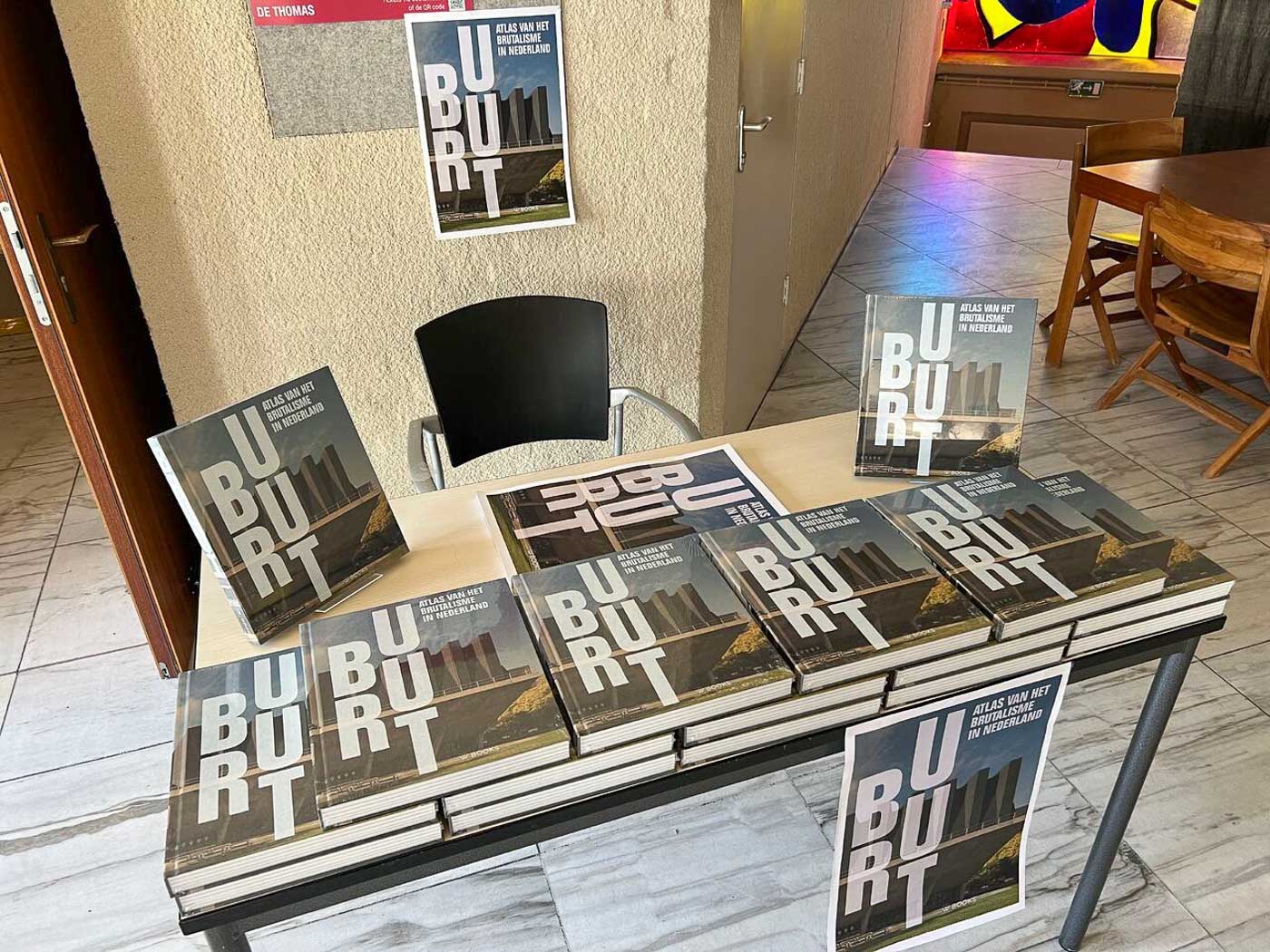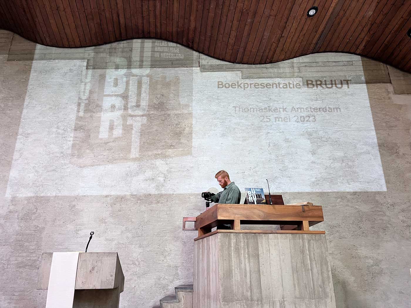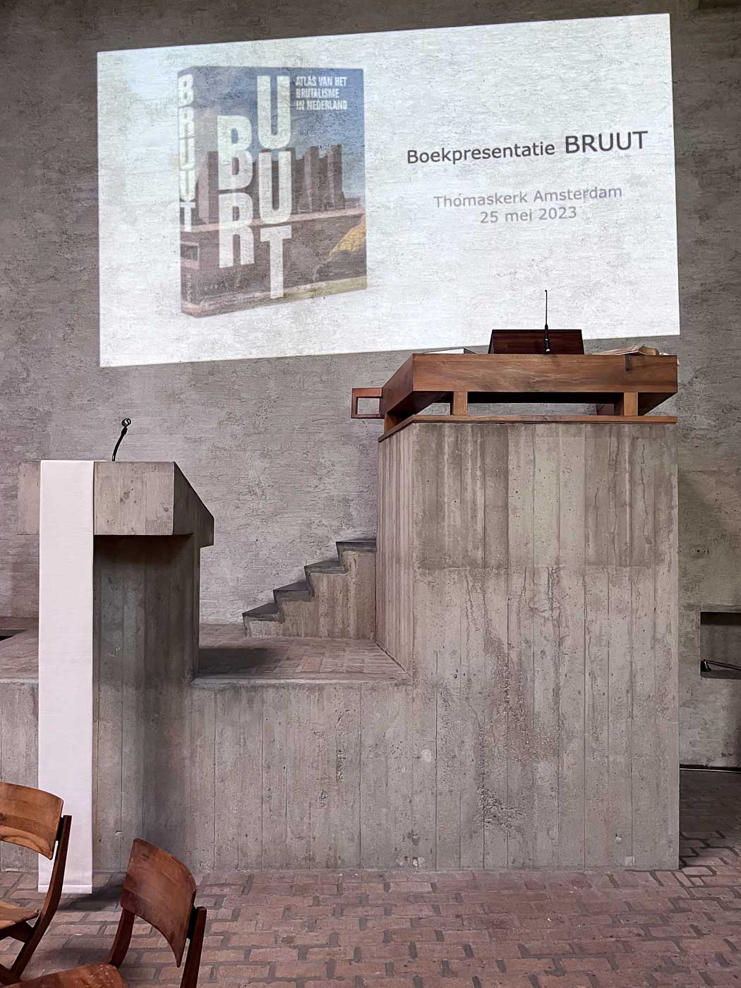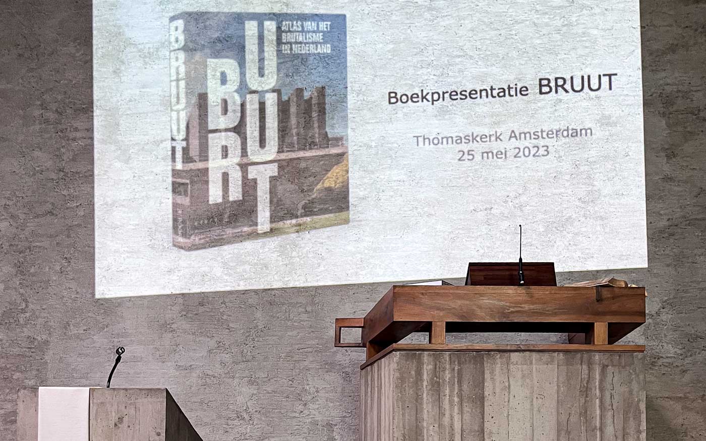 In een lekker volle Thomaskerk op de Zuidas van Amsterdam is donderdag 25 mei ‘BRUUT – Atlas van het brutalisme in Nederland’ gepresenteerd. Vanaf nu is het boek overal verkrijgbaar, bij de voorbestellers viel BRUUT al met een kloeke plof op de deurmat. In de bruutste kerk van Nederland was de boekverkoper snel door de toch forse stapel BRUUTS heen. De eerste exemplaren werden aangeboden aan de kinderen van de architecten Sier van Rhijn, Ben Ingwersen en Karel Sijmons.