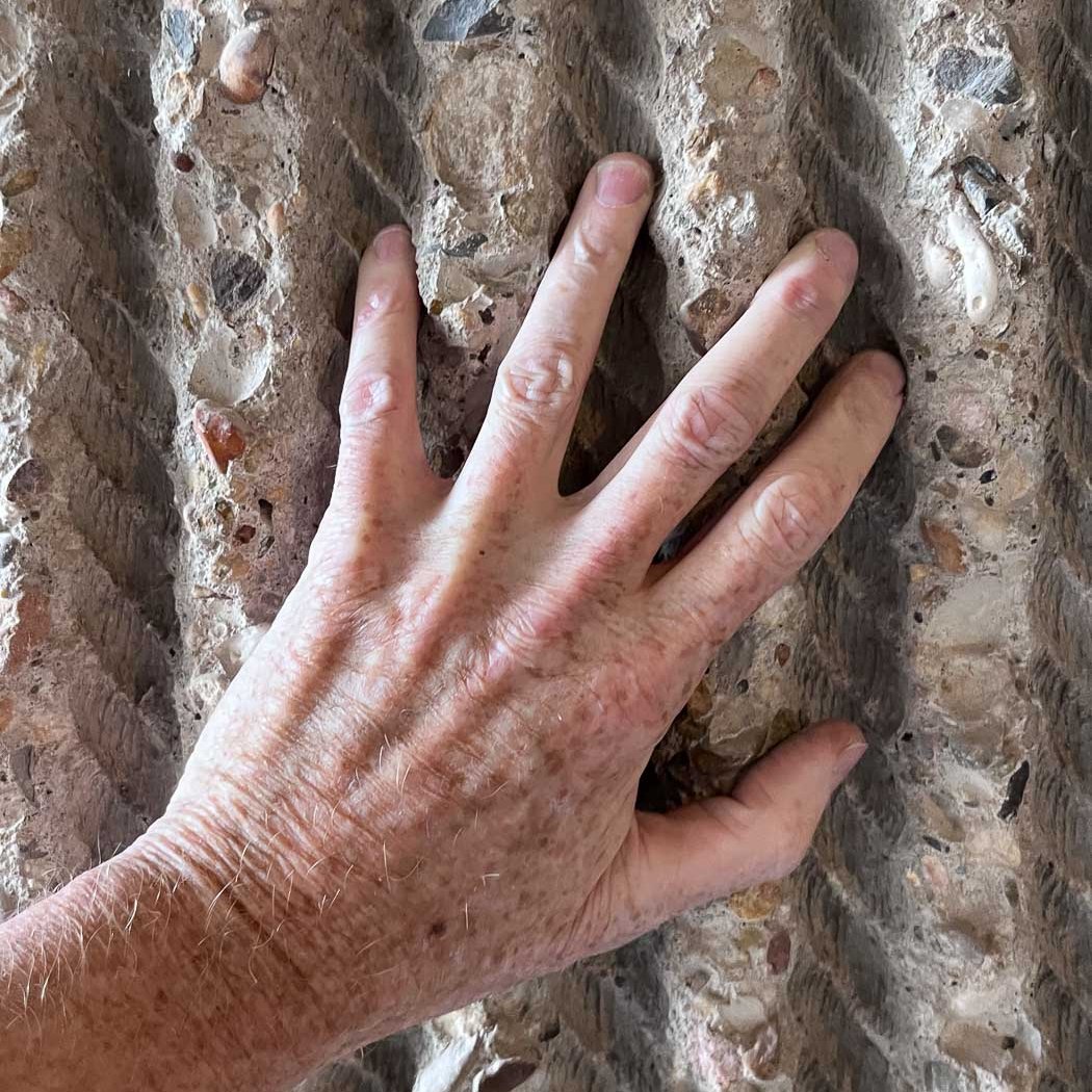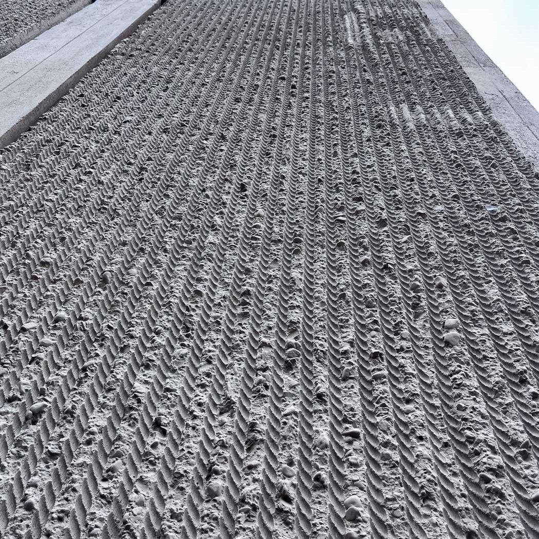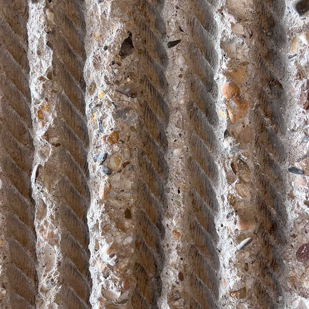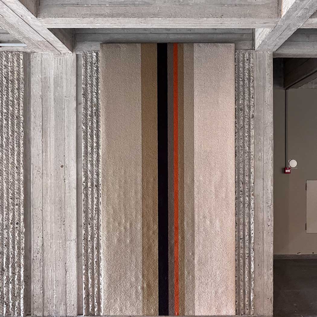 Mijn conclusie was snel getrokken: het kantongerecht is nog veel bijzonderder en mooier dan ik dacht. Is 4 sterren in de brutality score niet te weinig? We parkeren schuin achter het gebouw, en daar vallen gelijk de muren op in macramébeton: beton met de verticale afdrukken van nylon touwen erin. Zelfs de windingen zijn te zien. Tussen de dieperliggende afdrukken van de touwen in zijn de betonnen uitstulpsels met een hamer bewerkt: gebouchardeerd. Het grind komt hier in zicht; sommige stenen zijn eruit gevallen en laten een afdruk achter als een fossiele schelp in kalksteen. Echt heel bijzonder en uniek. Ik ken geen ander gebouw waar dit macramébeton te zien is. Andere textiele werkvormen zijn er ook: er hangen wandtapijten die in samenspraak met architect Ben Loerakker zijn ontworpen en geplaatst.