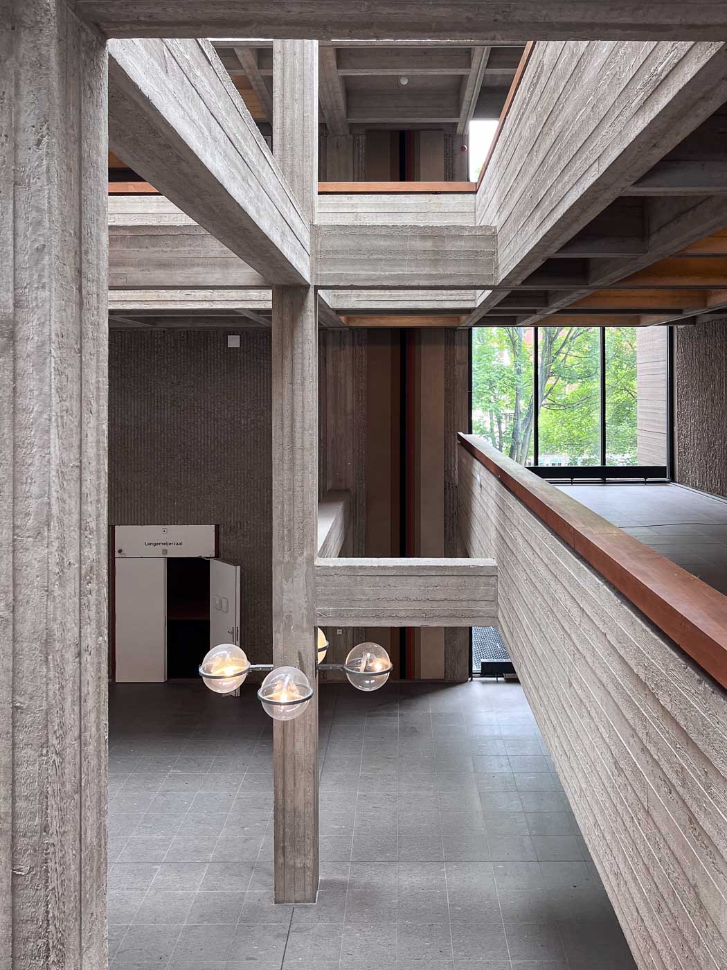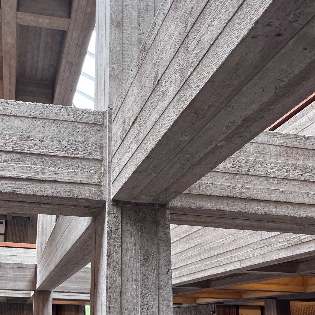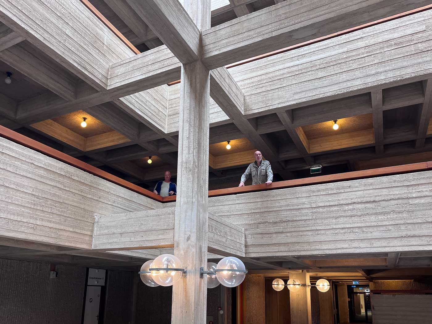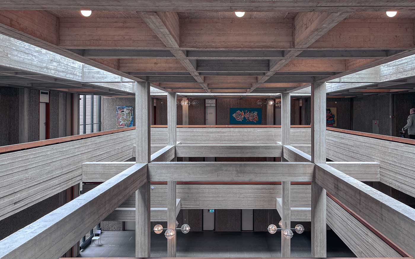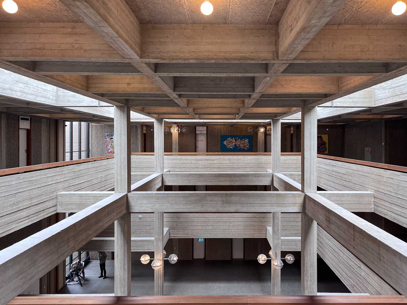 De centrale ruimte is open en tot het plafond is het betonskelet zichtbaar. Deze ruimte doet qua ruimte- en lichtwerking denken aan een kathedraal. Het beton is van het allerpuurste béton brut, waarin de afdrukken van de erg ruwe planken in alle details – van nerf tot knoest tot splinter – te zien zijn. De lijnen zijn horizontaal in de balken, verticaal in de pijlers. Het aaien van het beton aan de achterzijde van de balustrades is niet zonder gevaar. Het lijkt wel hout: op het beton zitten splinters van de bekistingsplanken. Splinters uit om en nabij 1972. Ook dit heb ik nog niet eerder gezien of gevoeld bij een van de gebouwen die ik bezocht.