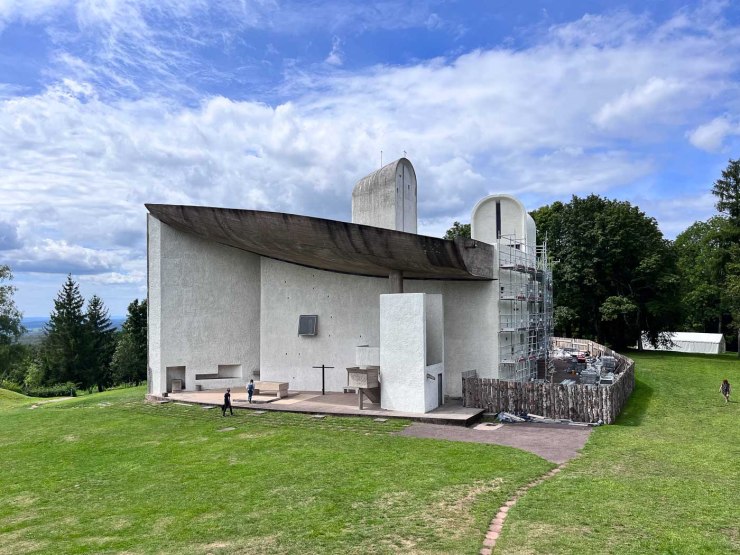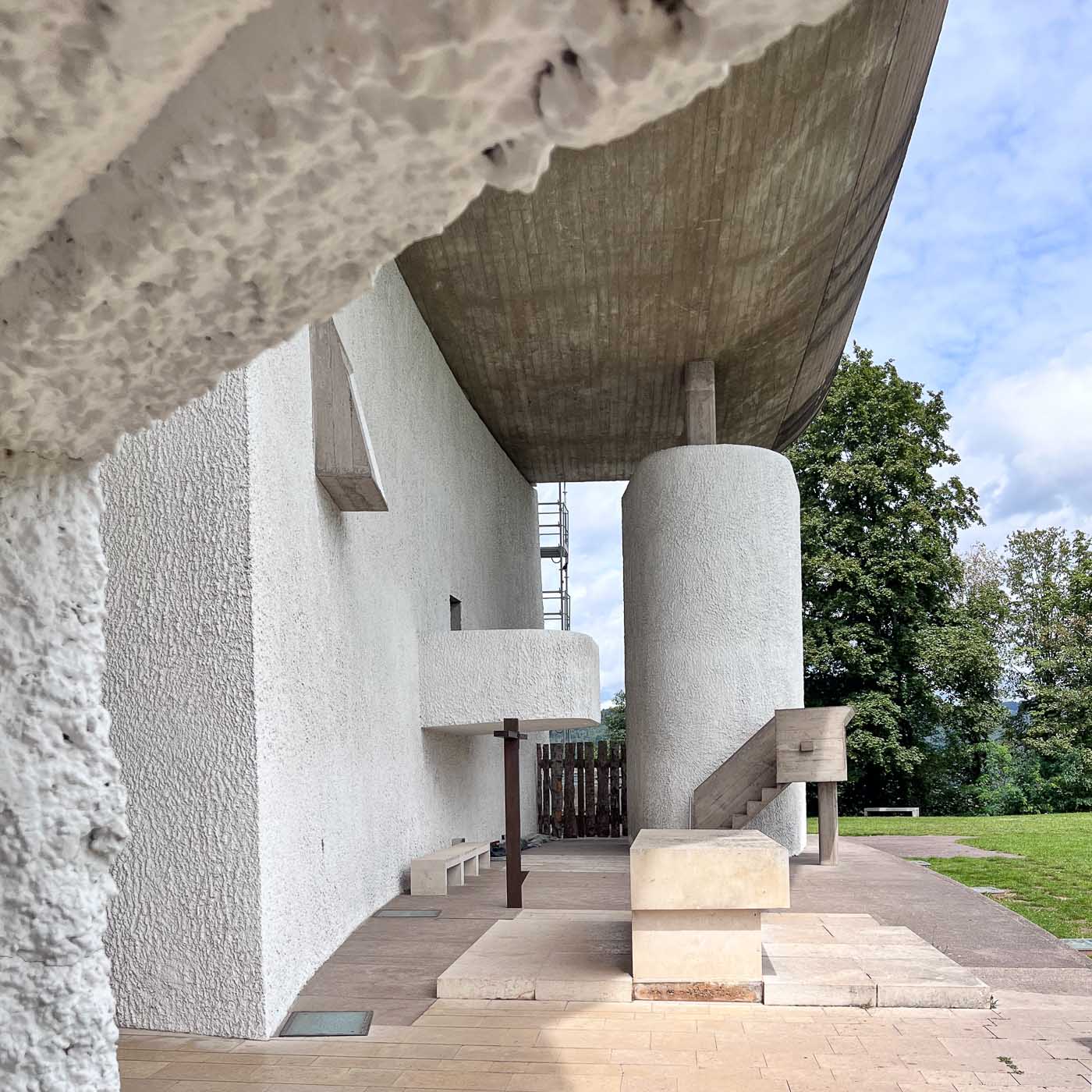 De kapel staat op een beboste heuvel bij de zogenaamde Bourgondische Poort nabij Belfort. Vanuit Lomont, waar onze minicamping is, is aan de overkant van het dal, hemelsbreed 5 km verderop, de kapel te zien. En hij ligt ‘haut’, het is een hele klim naar de top, maar zelden is een klim zo de moeite waard. Via de door Renzo Piano ontworpen porterie, het bezoekerscentrum met een museumwinkel met allemaal Corbu- en architectuurparafernalia, betreden we het terrein. Piano ontwierp ook het klooster en oratorium (2011), die bescheiden in de omgeving opgaan.