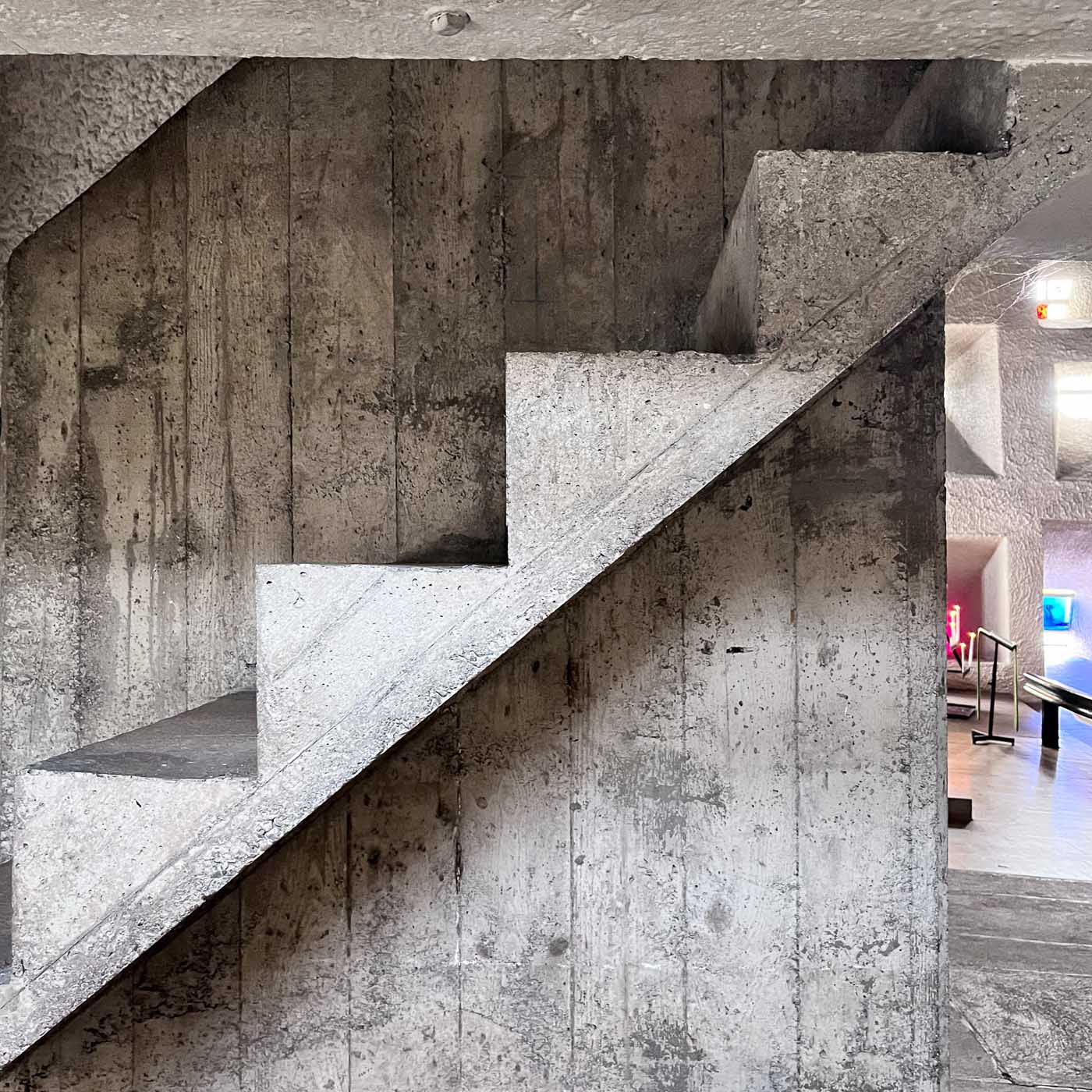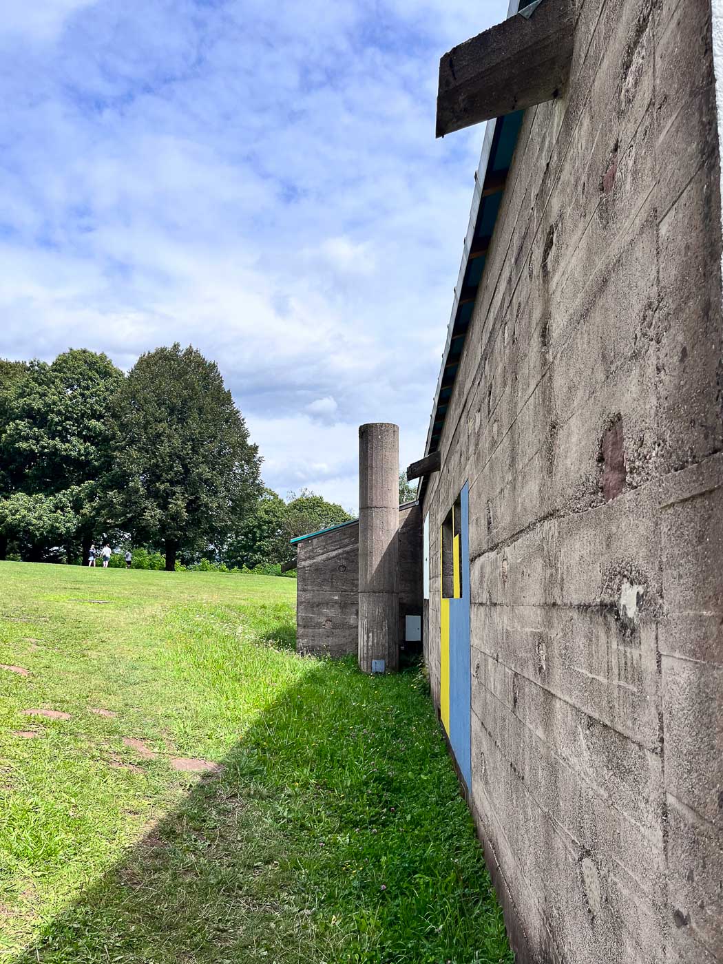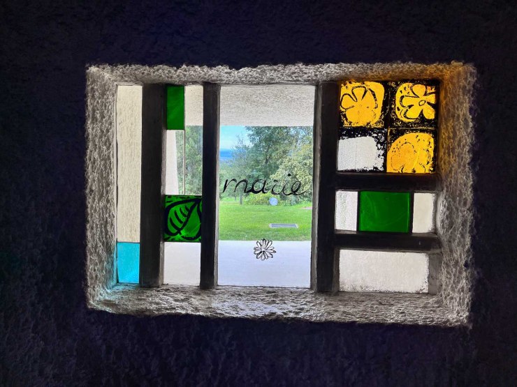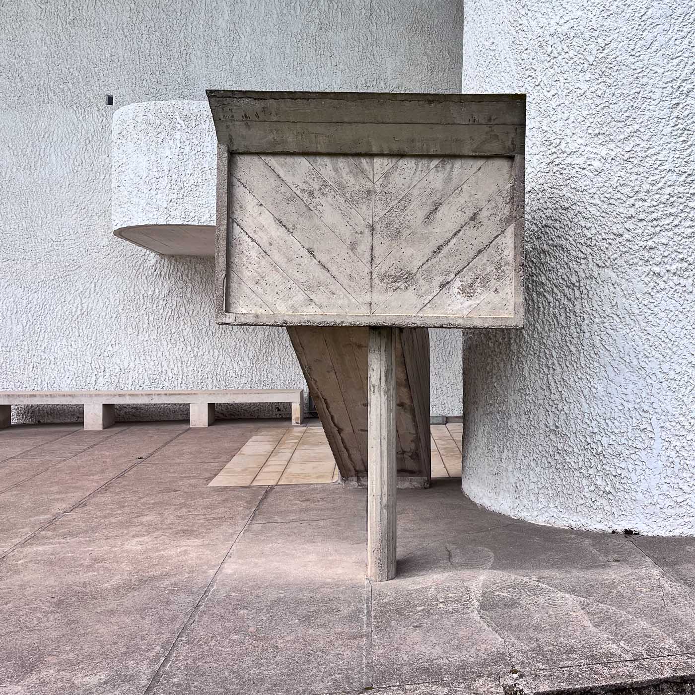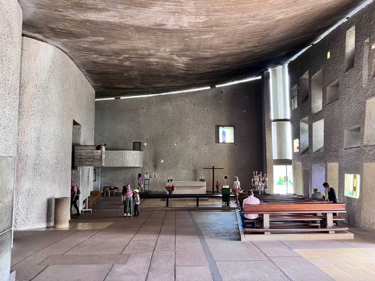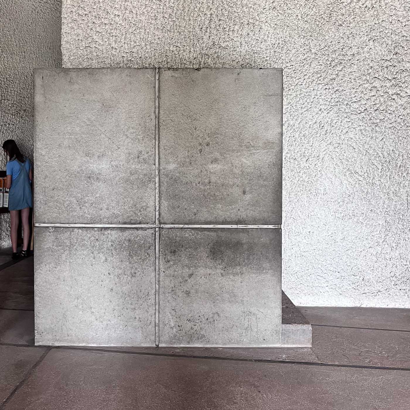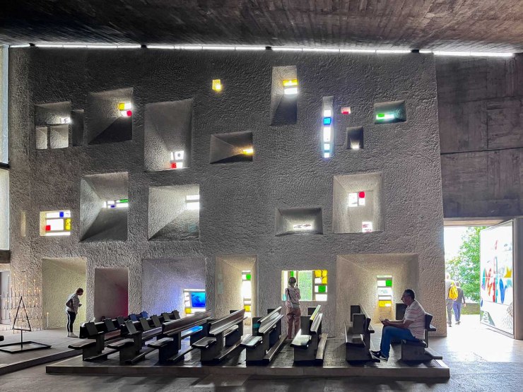 Eerst komen we – rechts – langs het pelgrimsverblijf, opgetrokken in béton brut en geverfd in de kleuren uit Le Corbusiers bekende palet, en links de eveneens uiterste brute kapelaanswoning. En daar staat ze dan: Notre Dame du Haut herself, zoals ik haar al vaak heb gezien op oneindige aantallen foto’s in oneindige aantallen posts in brute groepen op Instagram en Facebook. Wat is ze mooi. De achterkant van het gebouw staat in de steigers, maar de overbekende voorzijde staat gelukkig vrij. De hoognodige (beton)restauratie gaat nog tot 2024 duren en wordt uiterst consciëntieus aangepakt. Ook het interieur wordt daarbij onderhanden genomen, met inbegrip van de glas-in-loodramen. De kapel is van binnen kleiner dan ik had verwacht, maar het is een feest om er rond te lopen.