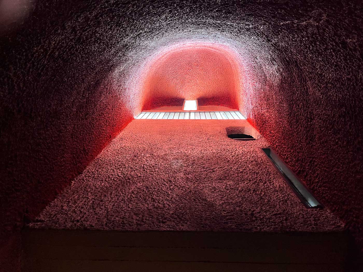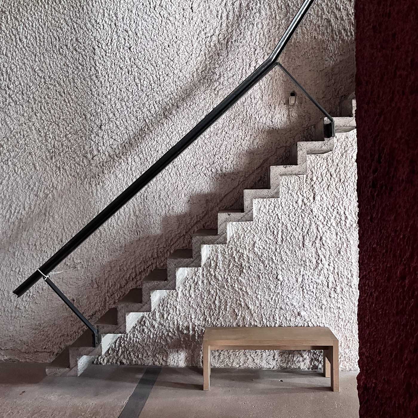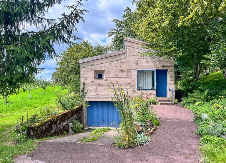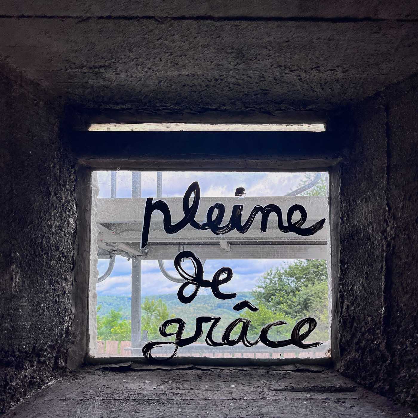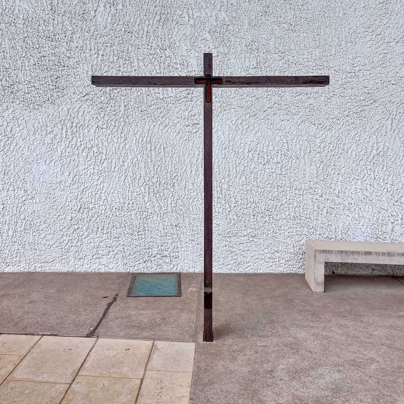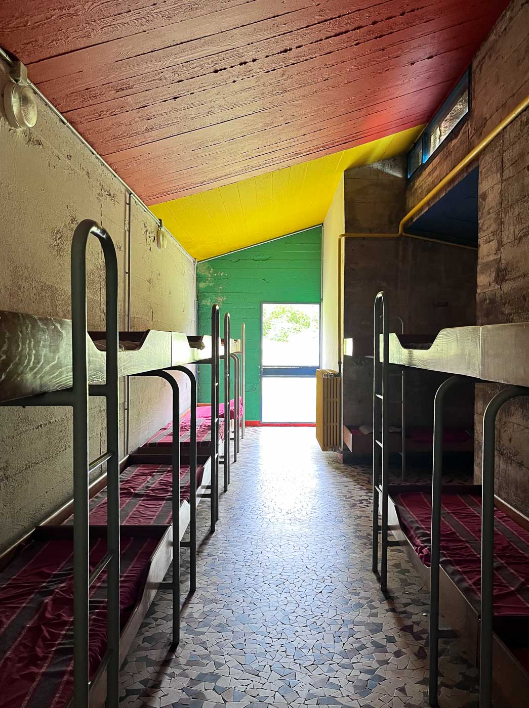 Eerst komen we – rechts – langs het pelgrimsverblijf, opgetrokken in béton brut en geverfd in de kleuren uit Le Corbusiers bekende palet, en links de eveneens uiterste brute kapelaanswoning. En daar staat ze dan: Notre Dame du Haut herself, zoals ik haar al vaak heb gezien op oneindige aantallen foto’s in oneindige aantallen posts in brute groepen op Instagram en Facebook. Wat is ze mooi. De achterkant van het gebouw staat in de steigers, maar de overbekende voorzijde staat gelukkig vrij. De hoognodige (beton)restauratie gaat nog tot 2024 duren en wordt uiterst consciëntieus aangepakt. Ook het interieur wordt daarbij onderhanden genomen, met inbegrip van de glas-in-loodramen. De kapel is van binnen kleiner dan ik had verwacht, maar het is een feest om er rond te lopen.