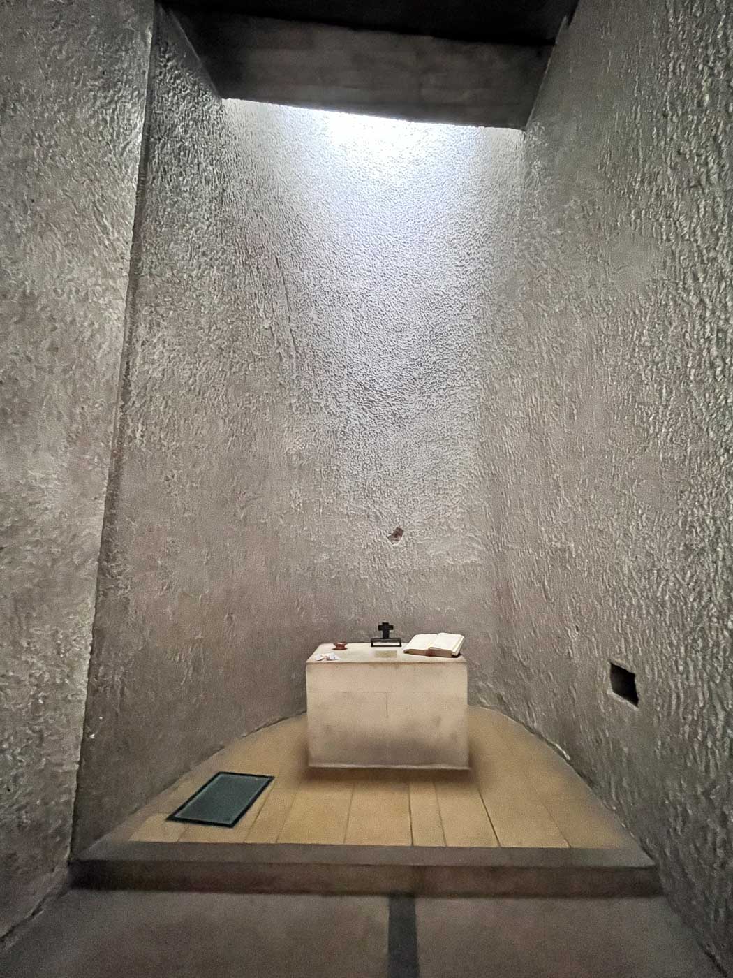 Het lichtgebruik is heel bijzonder en vormde een zeer belangrijke inspiratie voor de naoorlogse kerkenbouw. Er zijn drie bidkapellen die indirect licht ontvangen via een toren. Feeëriek licht dat subtiel de ruimtes vult. Van een van de ‘bidtorens’ zijn de muren rood geverfd, symbool voor het bloed van JC en van het bloed dat werd vergoten bij de gevechten om deze strategisch gelegen heuvel.