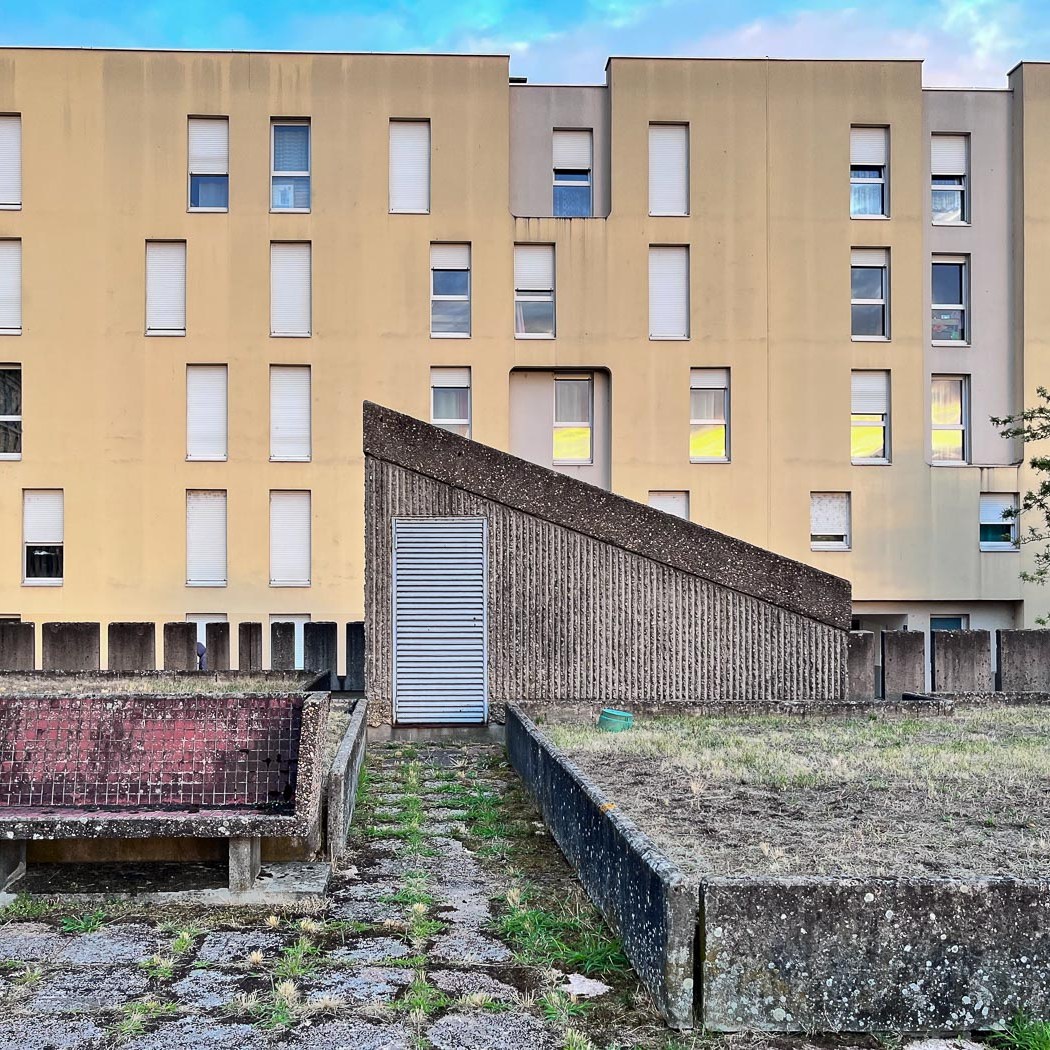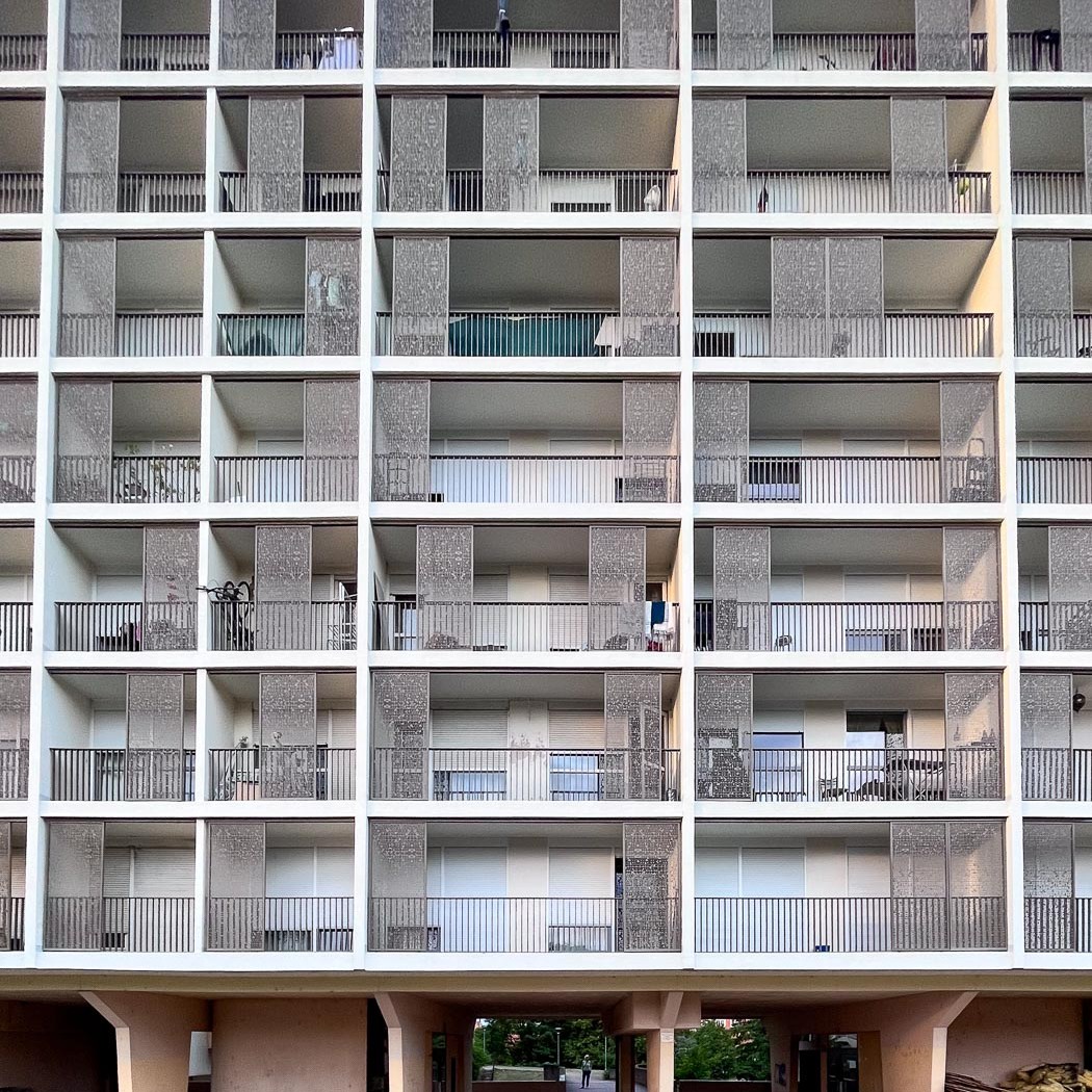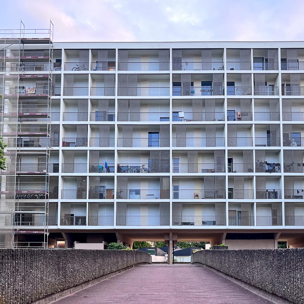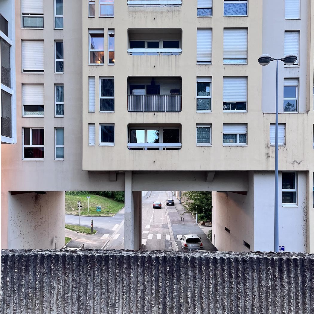Als we verder de wijk in lopen met laagbouw waarover duidelijk is nagedacht, komen we bij een doorgang onder een flat door. De zon schijnt er in de volle glorie van het golden hour doorheen en belicht het ribbeltjesbeton – in goed Frans beter bekend als corduroybeton – magnifiek. Het beton doet denken aan dat van de muren van het Kantongerecht in Amsterdam van Ben Loerakker met zijn verticale groeven die hier zijn gevormd door latten die in de bekisting zijn gelegd. Het cement stulpte tussen de latten door, droogde op en werd daarna onregelmatig weggebikt. Die onregelmatigheid wordt nog versterkt door het zeer grove grind in het beton. Ook de balkons zijn bekleed met platen van ditzelfde ribbeton.