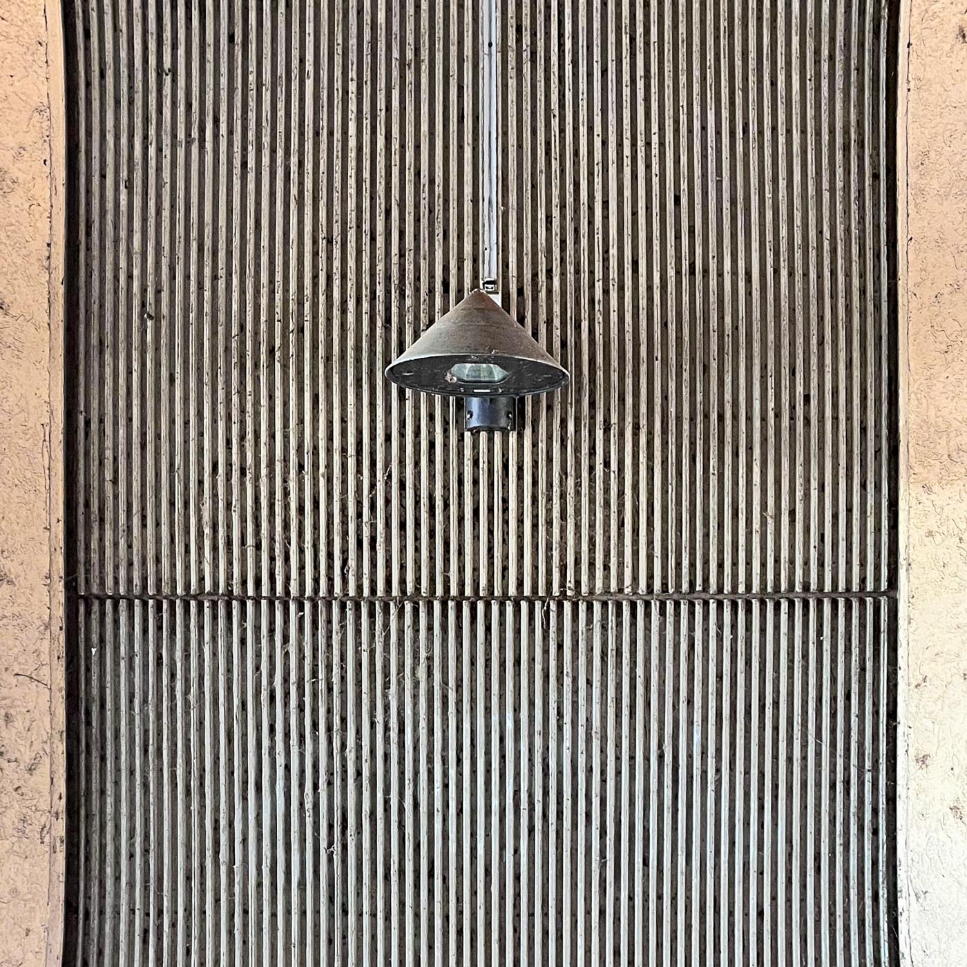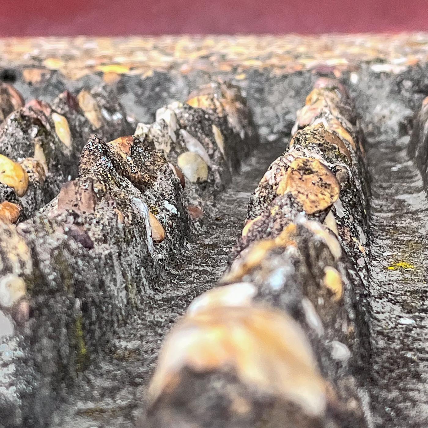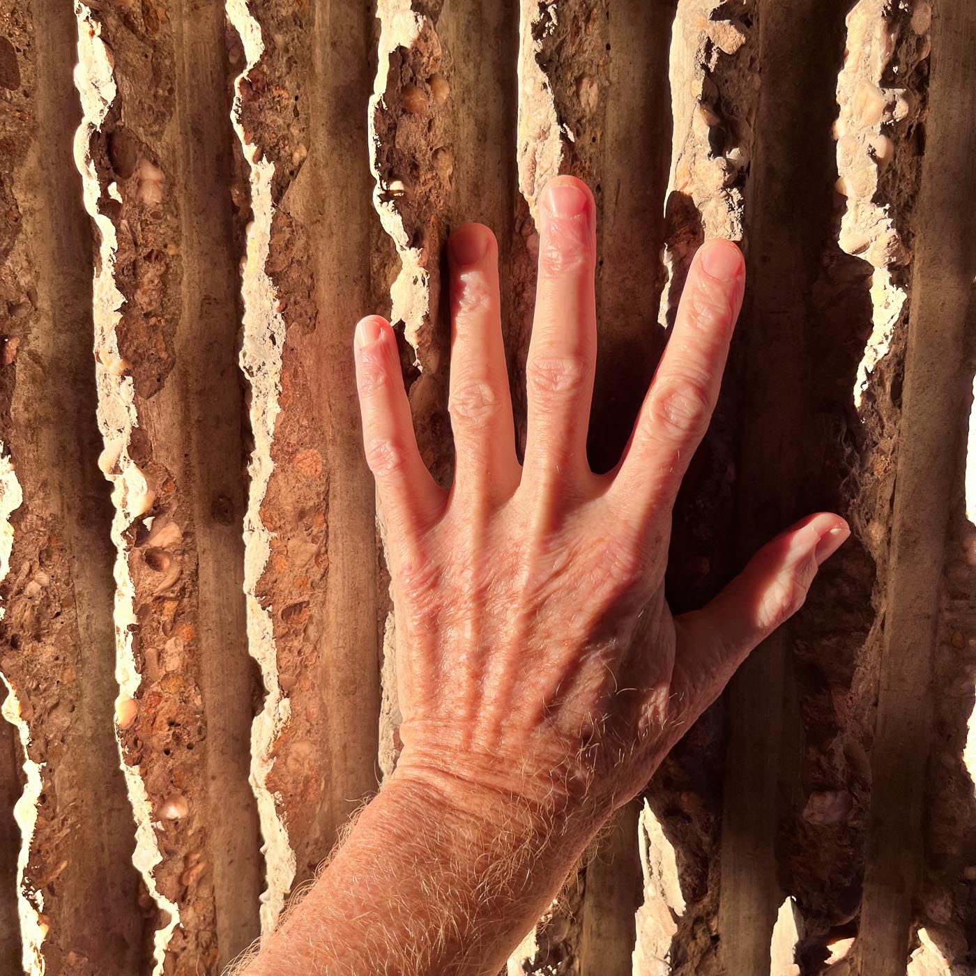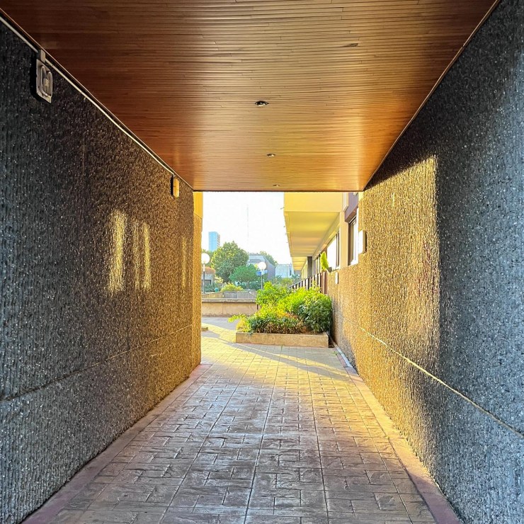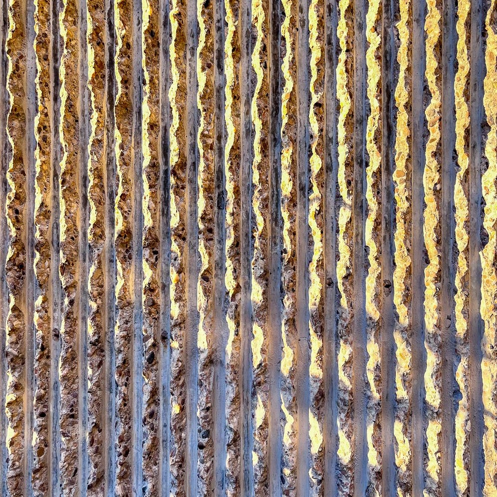 Als we verder de wijk in lopen met laagbouw waarover duidelijk is nagedacht, komen we bij een doorgang onder een flat door. De zon schijnt er in de volle glorie van het golden hour doorheen en belicht het ribbeltjesbeton – in goed Frans beter bekend als corduroybeton – magnifiek. Het beton doet denken aan dat van de muren van het Kantongerecht in Amsterdam van Ben Loerakker met zijn verticale groeven die hier zijn gevormd door latten die in de bekisting zijn gelegd. Het cement stulpte tussen de latten door, droogde op en werd daarna onregelmatig weggebikt. Die onregelmatigheid wordt nog versterkt door het zeer grove grind in het beton. Ook de balkons zijn bekleed met platen van ditzelfde ribbeton.