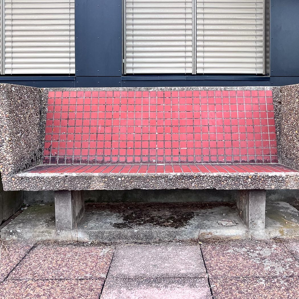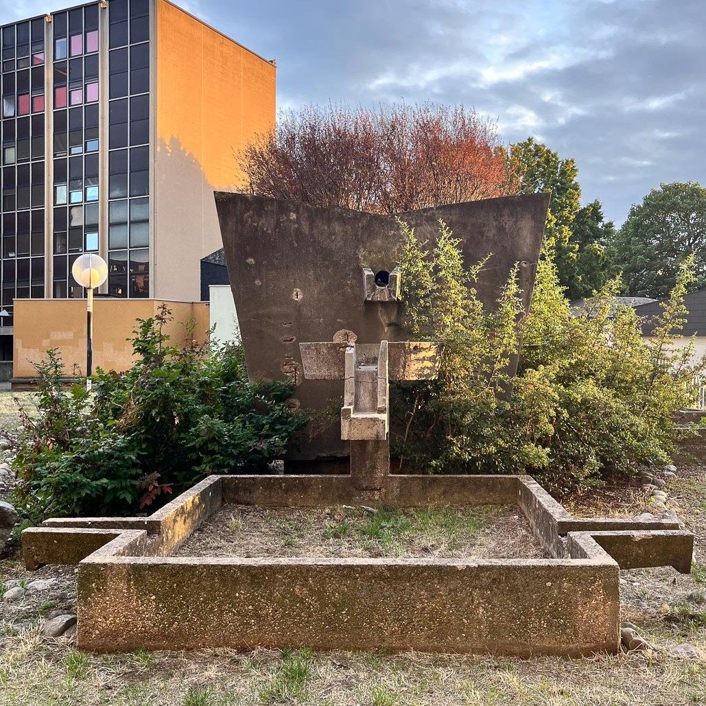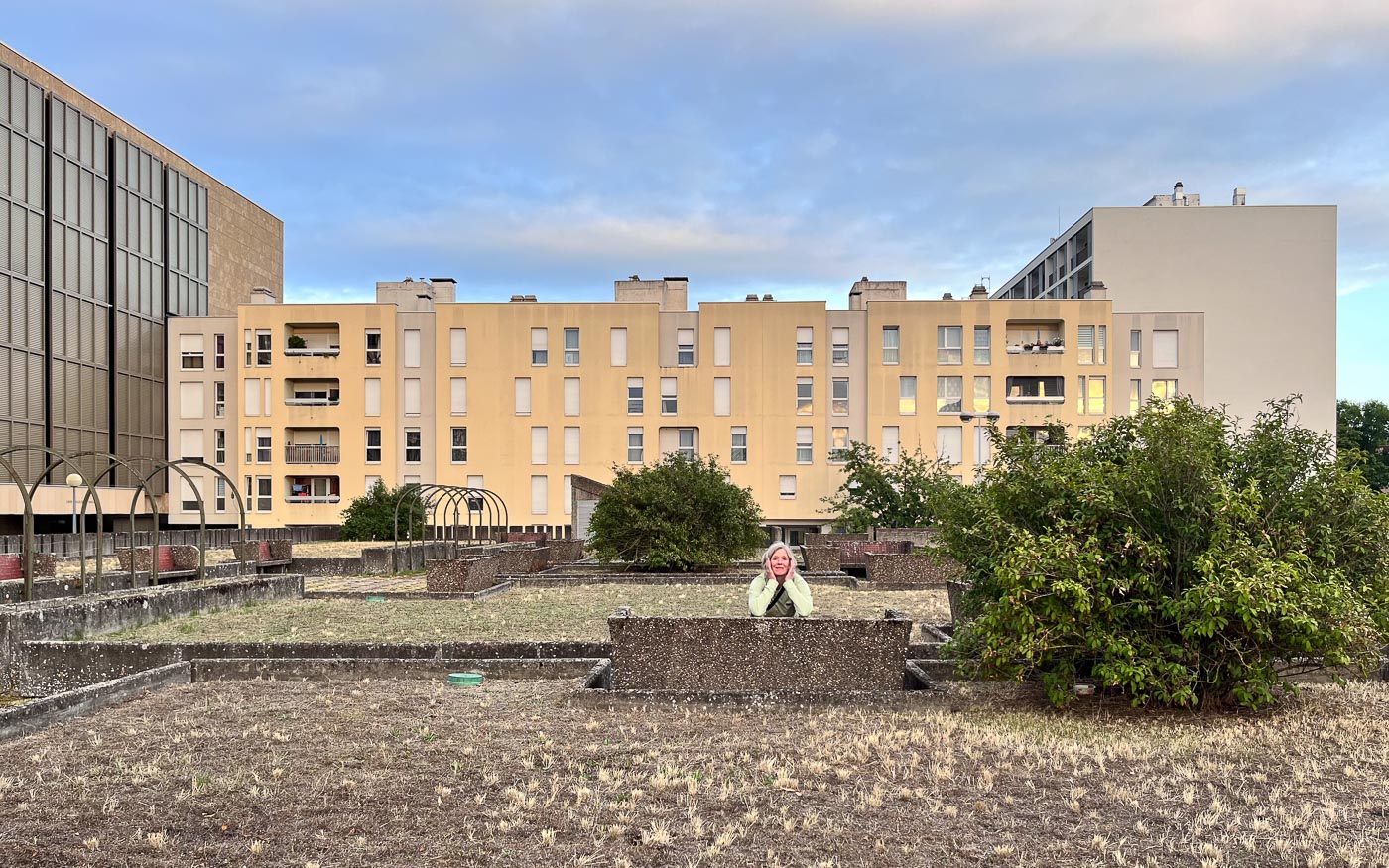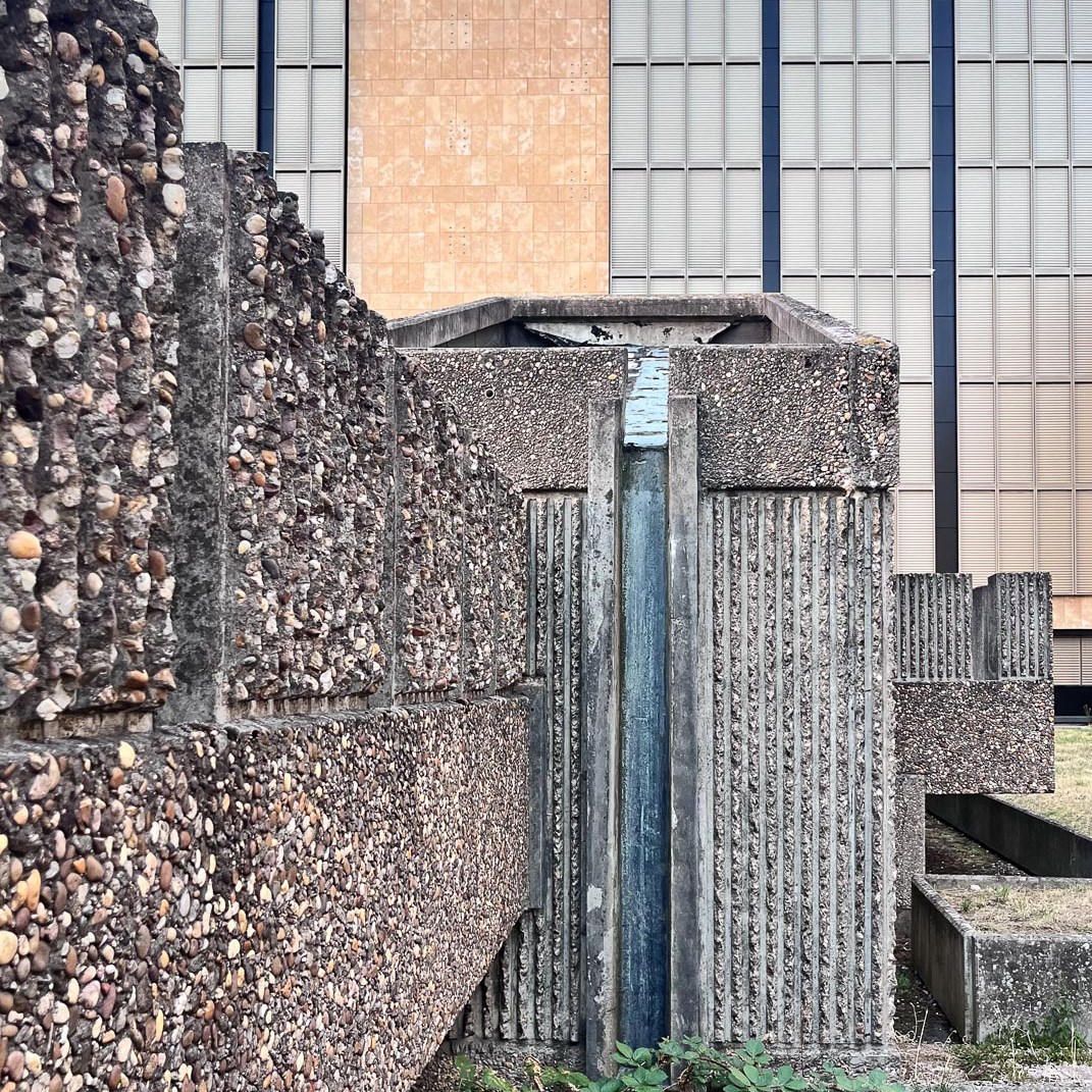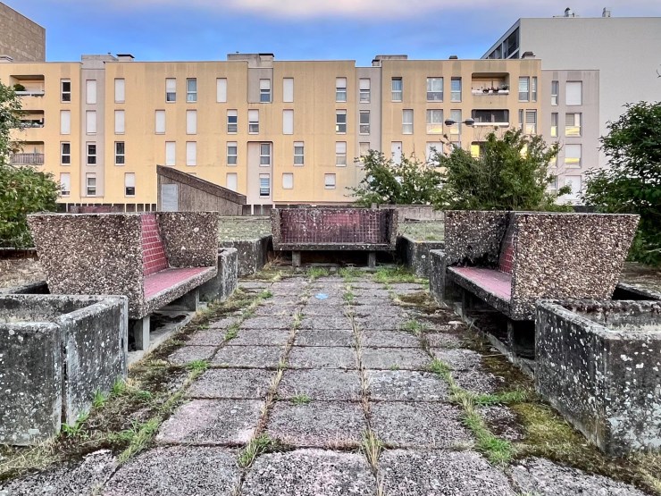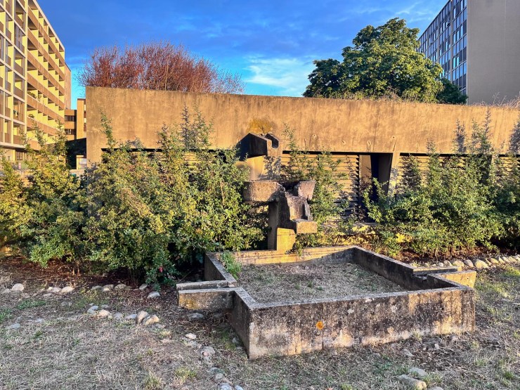 We komen op een binnenplaats op één verdieping boven straatniveau. Het is een kruising tussen een stadspark en een dakterras. Dit moet ooit echt fantastische zijn geweest, maar ziet er nu weinig florissant uit, alhoewel uitermate fotogeniek. Een niet meer functionerende fontein en een rosarium zonder rozen maar wel veel grindbetonnen bankjes maken het beeld compleet. Het is een feest voor de echte betonfetisjist en hoewel er duidelijk sprake is van achterstallig onderhoud ziet het er toch best netjes uit: dit is geen hangplek, er is nauwelijks graffiti of afval, dus dat biedt hoop. De ernaast gelegen flat staat aan de achterkant in de steigers en is aan de voorkant al gerenoveerd.