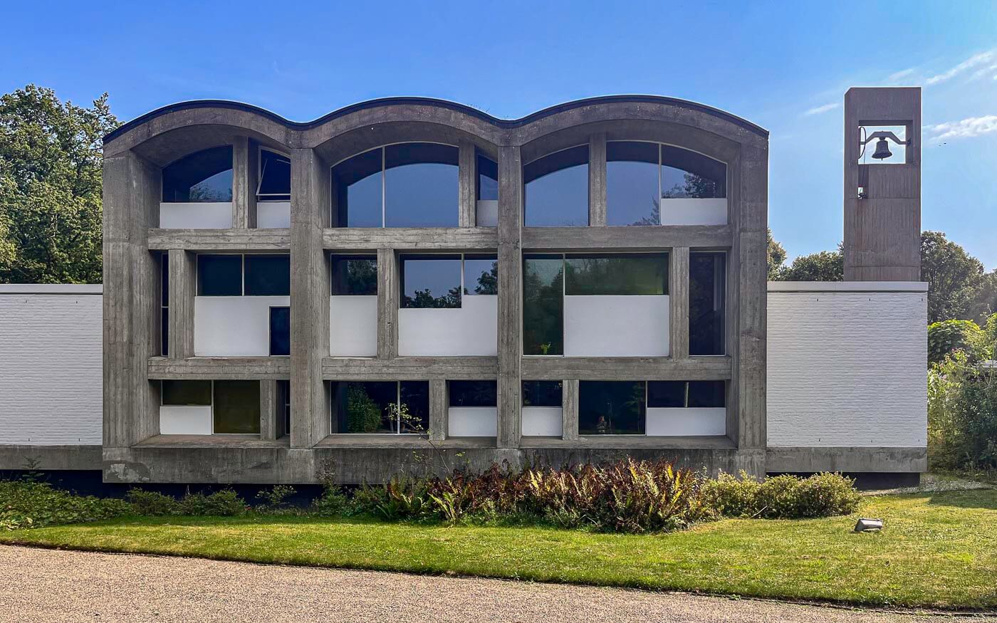 Vrijdag ging ik te kerke in Aerdenhout, waar al sinds 1958 het evangelie van het brutalisme wordt gepredikt in de Adventskerk, de nummer 14 van de brute top 20 van BRUUT – Atlas van het brutalisme in Nederland. Het was het enige gebouw uit de top 20 dat ik nog nooit had gezien. Fotograaf Bart reed er graag even voor om. En het was de moeite waard, ook al konden we de kerk niet in.